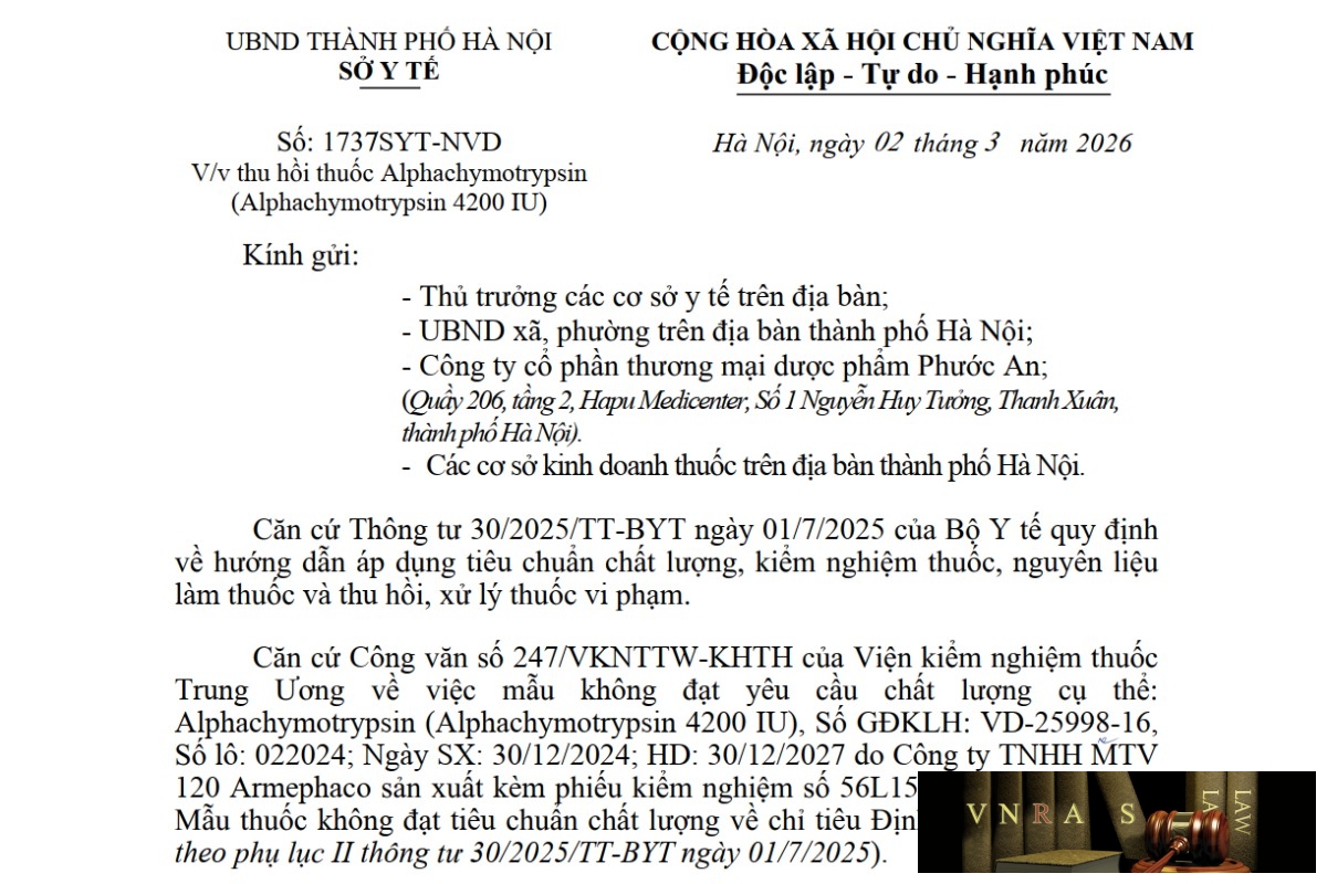 Căn cứ Công văn số 247/VKNTTW-KHTH của Viện kiểm nghiệm thuốc Trung Ương về việc mẫu không đạt yêu cầu chất lượng cụ thể: Alphachymotrypsin (Alphachymotrypsin 4200 IU), Số GĐKLH: VD-25998-16, Số lô: 022024; Ngày SX: 30/12/2024; HD: 30/12/2027 do Công ty TNHH MTV 120 Armephaco sản xuất kèm phiếu kiểm nghiệm số 56L153 ngày 25/02/2026. Mẫu thuốc không đạt tiêu chuẩn chất lượng về chỉ tiêu Định lượng; (mức độ 2 theo phụ lục II thông tư 30/2025/TT-BYT ngày 01/7/2025).