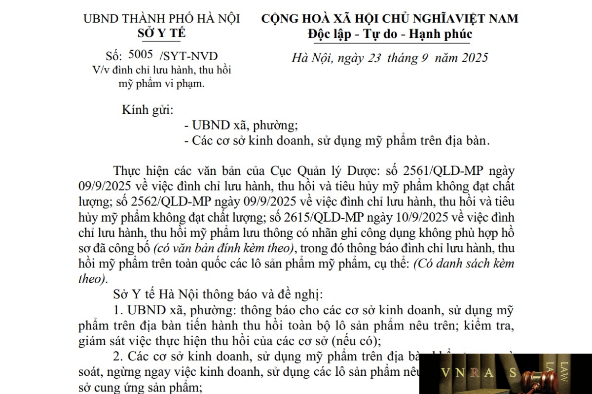 Thực hiện các văn bản của Cục Quản lý Dược: số 2561/QLD-MP ngày 09/9/2025 về việc đình chỉ lưu hành, thu hồi và tiêu hủy mỹ phẩm không đạt chất lượng; số 2562/QLD-MP ngày 09/9/2025 về việc đình chỉ lưu hành, thu hồi và tiêu hủy mỹ phẩm không đạt chất lượng; số 2615/QLD-MP ngày 10/9/2025 về việc đình chỉ lưu hành, thu hồi mỹ phẩm lưu thông có nhãn ghi công dụng không phù hợp hồ sơ đã công bố (có văn bản đính kèm theo), trong đó thông báo đình chỉ lưu hành, thu hồi mỹ phẩm trên toàn quốc các lô sản phẩm mỹ phẩm, cụ thể: (Có danh sách kèm theo).