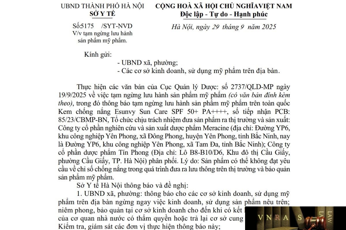 Thực hiện các văn bản của Cục Quản lý Dược: số 2737/QLD-MP ngày 19/9/2025 về việc tạm ngừng lưu hành sản phẩm mỹ phẩm (có văn bản đính kèm theo), trong đó thông báo tạm ngừng lưu hành sản phẩm mỹ phẩm trên toàn quốc Kem chống nắng Esunvy Sun Care SPF 50+ PA++++, số tiếp nhận PCB: 85/23/CBMP-BN, Tổ chức chịu trách nhiệm đưa sản phẩm ra thị trường và sản xuất: Công ty cổ phần nghiên cứu và sản xuất dược phẩm Meracine (địa chỉ: Đường YP6, khu công nghiệp Yên Phong, xã Đông Phong, huyện Yên Phong, tỉnh Bắc Ninh, nay là Đường YP6, khu công nghiệp Yên Phong, xã Tam Đa, tỉnh Bắc Ninh); Công ty cổ phần dược phẩm Tín Phong (Địa chỉ: Lô B8-B10/D6, Khu đô thị Cầu Giấy, phường Cầu Giấy, TP. Hà Nội) phân phối. Lý do: Sản phẩm có thể không đạt yêu cầu về chỉ số chống nắng trong quá trình đưa ra lưu thông trên thị trường và bảo quản sản phẩm mỹ phẩm.