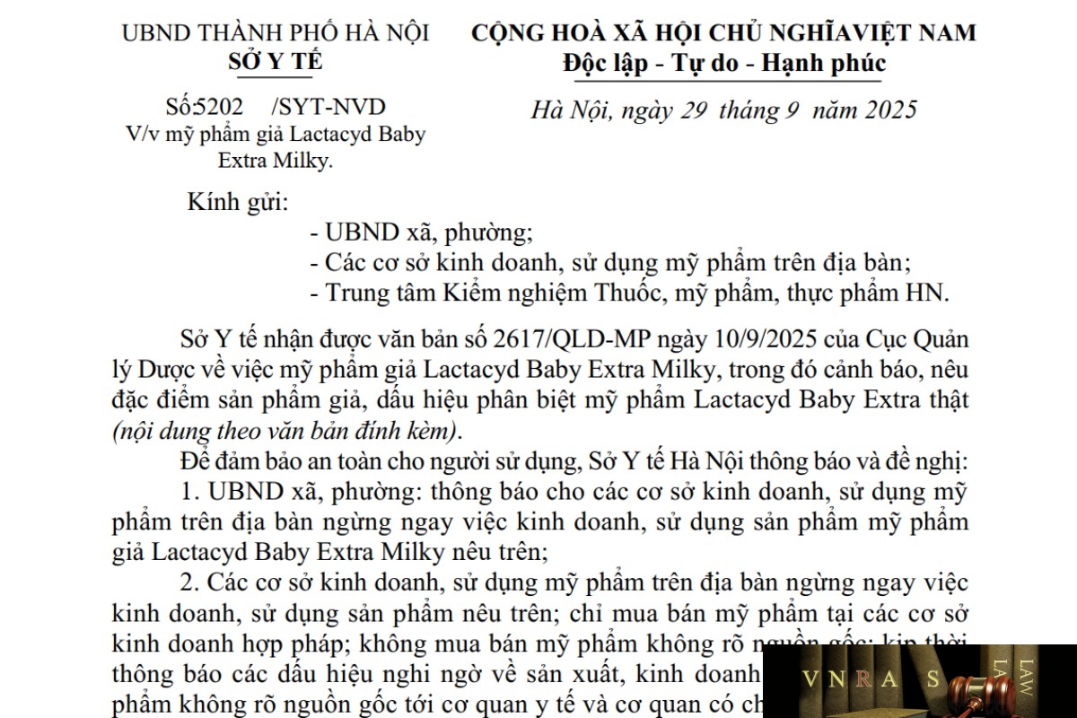 Công văn số : 5202/SYT-NVD Sở Y tế Hà Nội ngày 29 tháng 9 năm 2025 Về việc mỹ phẩm giả Lactacyd Baby Extra Milky