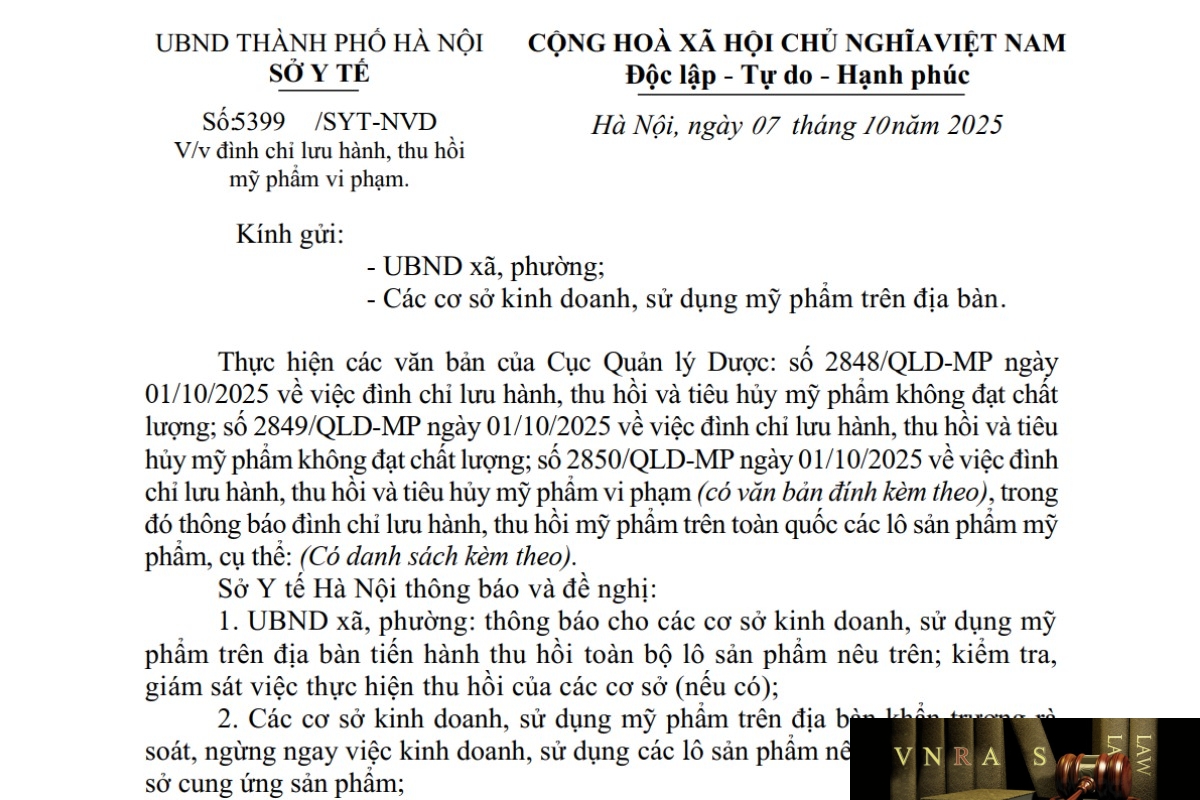Công văn số : 5399/SYT-NVD Sở Y tế Hà Nội ngày 07 tháng 10 năm 2025 Về việc đình chỉ lưu hành, thu hồi mỹ phẩm vi phạm