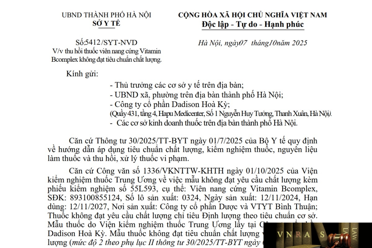 Căn cứ Công văn số 1336/VKNTTW-KHTH ngày 01/10/2025 của Viện kiểm nghiệm thuốc Trung Ương về việc mẫu không đạt yêu cầu chất lượng kèm phiếu kiểm nghiệm số 55L593, cụ thể: Viên nang cứng Vitamin Bcomplex, SĐK: 893100855124, Số lô sản xuất: 0324, Ngày sản xuất: 12/11/2024, Hạn dùng: 12/11/2027, Nơi sản xuất: Công ty cổ phần Dược và VTYT Bình Thuận; Thuốc không đạt yêu cầu chất lượng chỉ tiêu Định lượng theo tiêu chuẩn cơ sở. Mẫu thuốc do Viện kiểm nghiệm thuốc Trung Ương lấy tại Công ty cổ phần Dadison Hoà Kỳ. Mẫu thuốc không đạt tiêu chuẩn chất lượng về chỉ tiêu Định lượng (mức độ 2 theo phụ lục II thông tư 30/2025/TT-BYT ngày 01/7/2025).