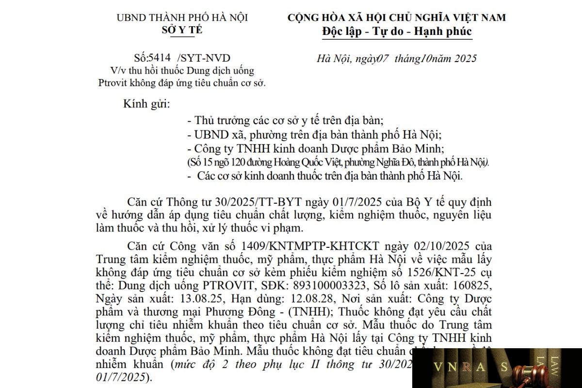Căn cứ Công văn số 1409/KNTMPTP-KHTCKT ngày 02/10/2025 của Trung tâm kiểm nghiệm thuốc, mỹ phẩm, thực phẩm Hà Nội về việc mẫu lấy không đáp ứng tiêu chuẩn cơ sở kèm phiếu kiểm nghiệm số 1526/KNT-25 cụ thể: Dung dịch uống PTROVIT, SĐK: 893100003323, Số lô sản xuất: 160825, Ngày sản xuất: 13.08.25, Hạn dùng: 12.08.28, Nơi sản xuất: Công ty Dược phẩm và thương mại Phương Đông – (TNHH); Thuốc không đạt yêu cầu chất lượng chỉ tiêu nhiễm khuẩn theo tiêu chuẩn cơ sở. Mẫu thuốc do Trung tâm kiểm nghiệm thuốc, mỹ phẩm, thực phẩm Hà Nội lấy tại Công ty TNHH kinh doanh Dược phẩm Bảo Minh. Mẫu thuốc không đạt tiêu chuẩn chất lượng về độ nhiễm khuẩn (mức độ 2 theo phụ lục II thông tư 30/2025/TT-BYT ngày 01/7/2025).