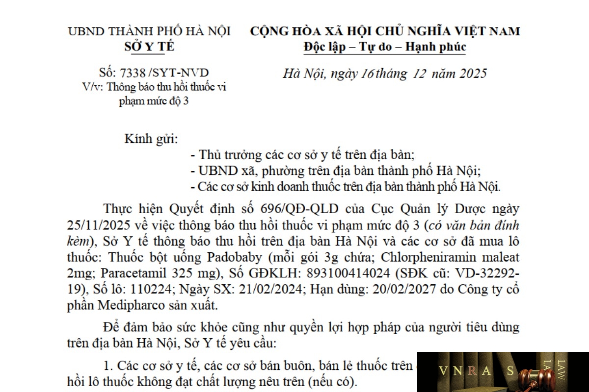 Thực hiện Quyết định số 696/QĐ-QLD của Cục Quản lý Dược ngày 25/11/2025 về việc thông báo thu hồi thuốc vi phạm mức độ 3 (có văn bản đính kèm), Sở Y tế thông báo thu hồi trên địa bàn Hà Nội và các cơ sở đã mua lô thuốc: Thuốc bột uống Padobaby (mỗi gói 3g chứa; Chlorpheniramin maleat 2mg; Paracetamil 325 mg), Số GĐKLH: 893100414024 (SĐK cũ: VD-32292-19), Số lô: 110224; Ngày SX: 21/02/2024; Hạn dùng: 20/02/2027 do Công ty cổ phần Medipharco sản xuất.
