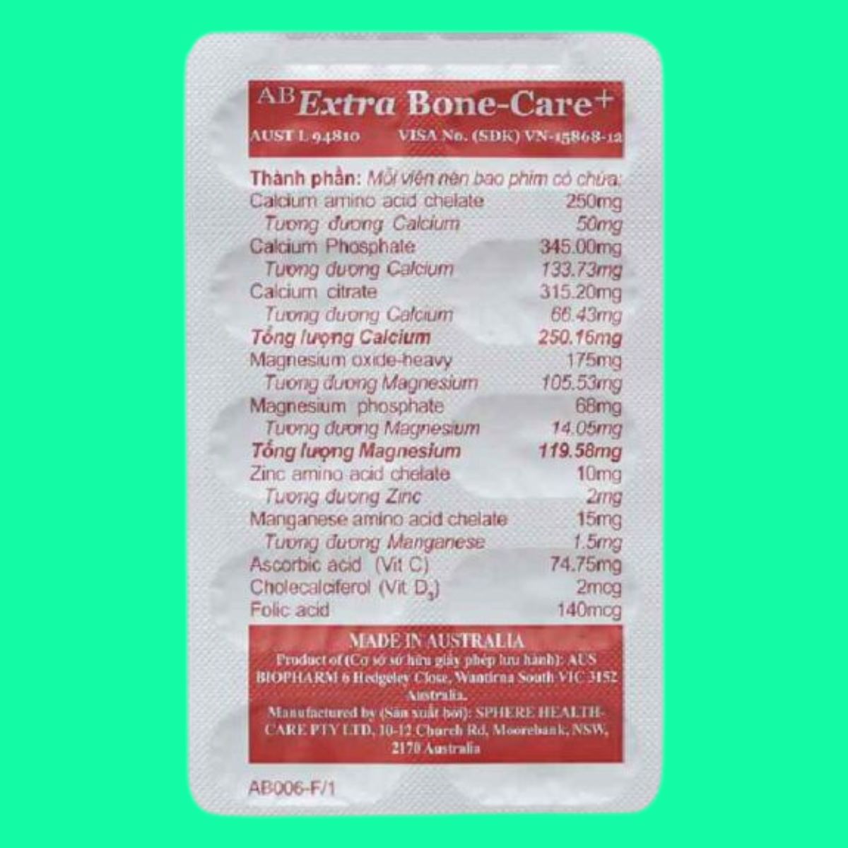 Trong bài viết này, dược sĩ Lưu Văn Hoàng giới thiệu đến các bạn Thuốc AB Extra Bone-Care+ được sản xuất bởi SPHERE HEALTHYCARE PTY LTD., có số đăng ký lưu hành tại Việt Nam là VN-15868-12