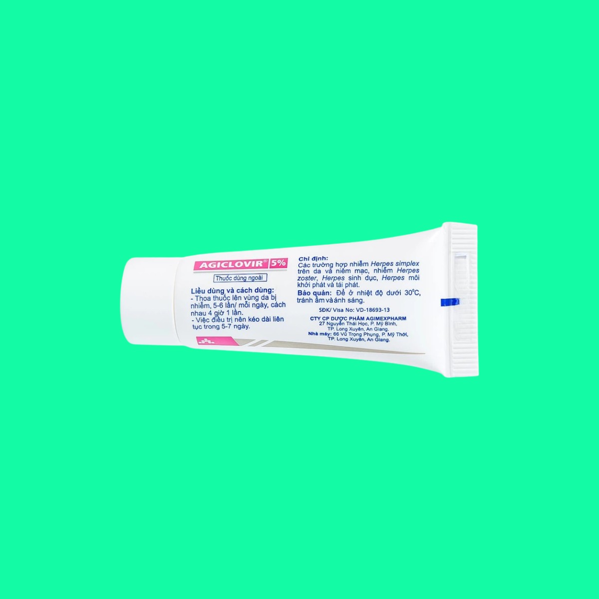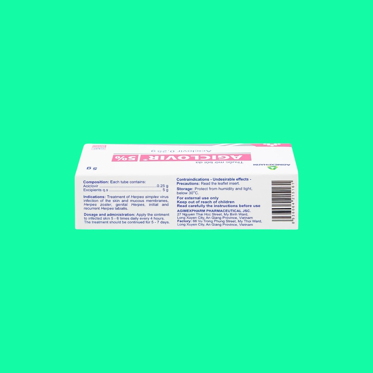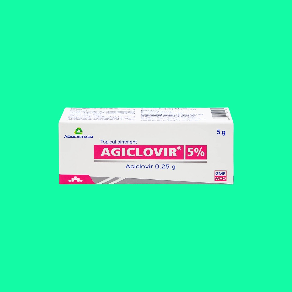 Sản phẩm thuốc Agiclovir 5% Agimexpharm được sản xuất bởi Công ty cổ phần dược phẩm Agimexpharm, có số đăng ký lưu hành tại Việt Nam là VD-18693-13, điều trị nhiễm virus Herpes simplex.