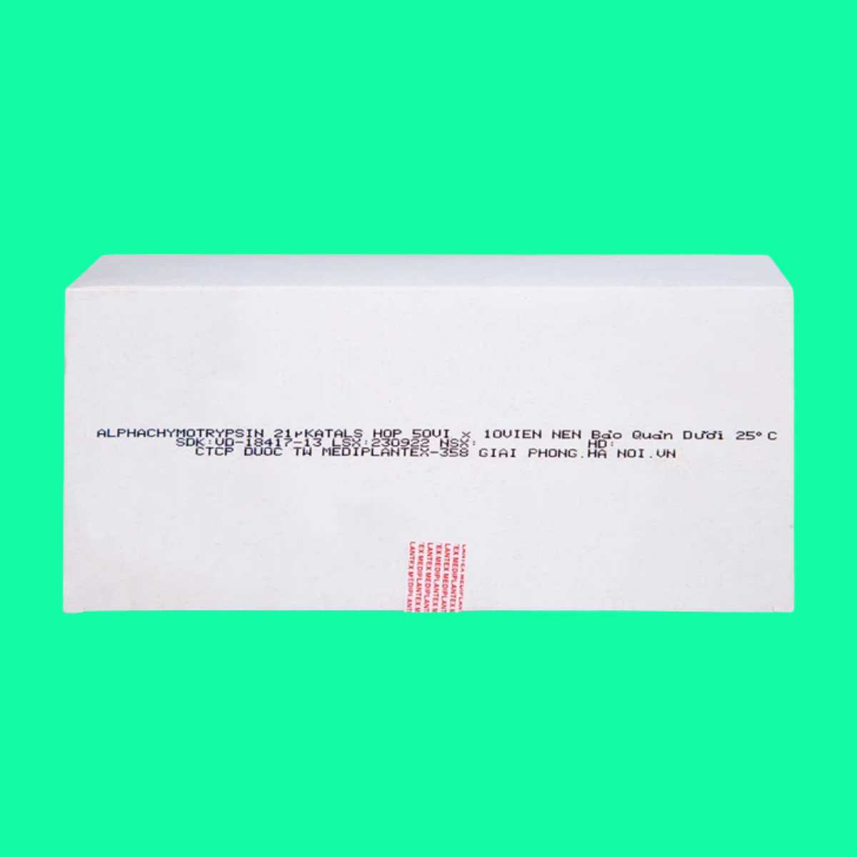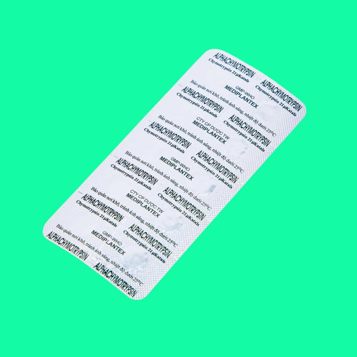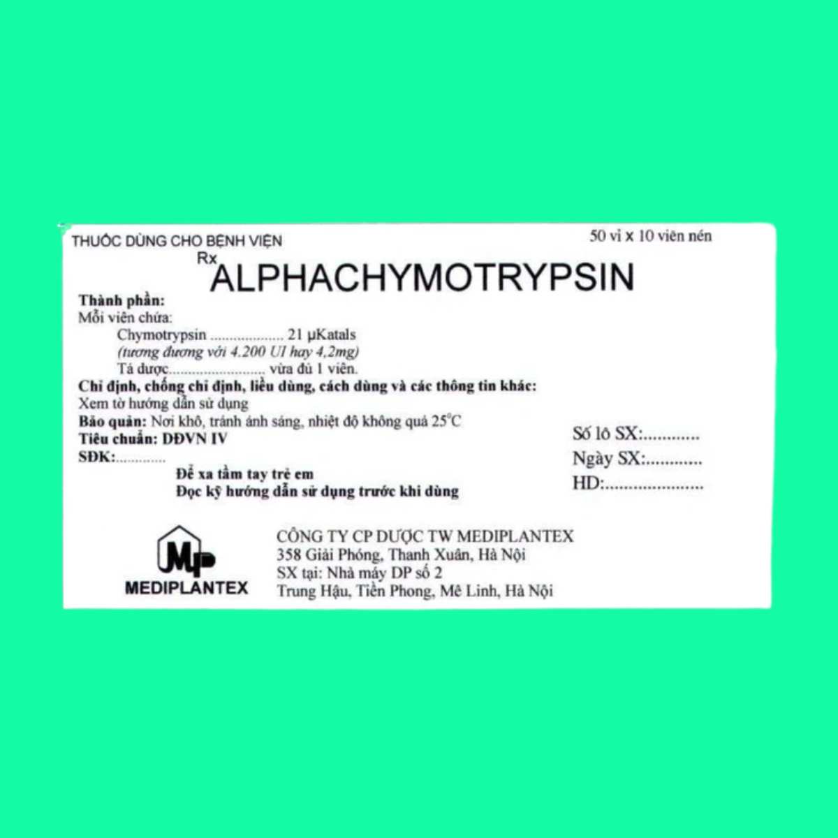 Sản phẩm thuốc Alphachymotrypsin Mediplantex được sản xuất bởi Công ty Cổ phần Dược Trung Ương Mediplantex có số đăng ký lưu hành tại Việt Nam là VD-18417-13, chống sưng phù nề sau phẫu thuật.