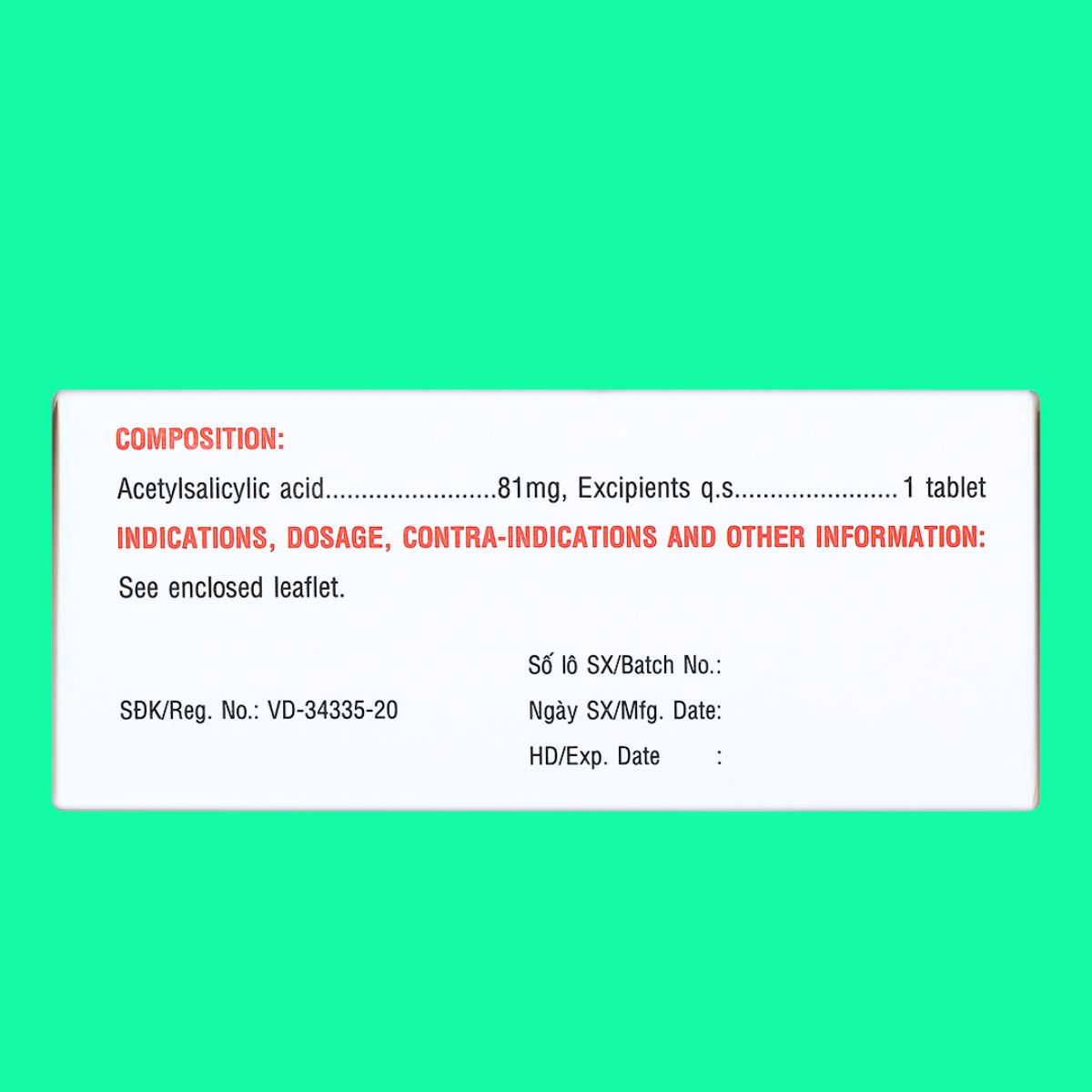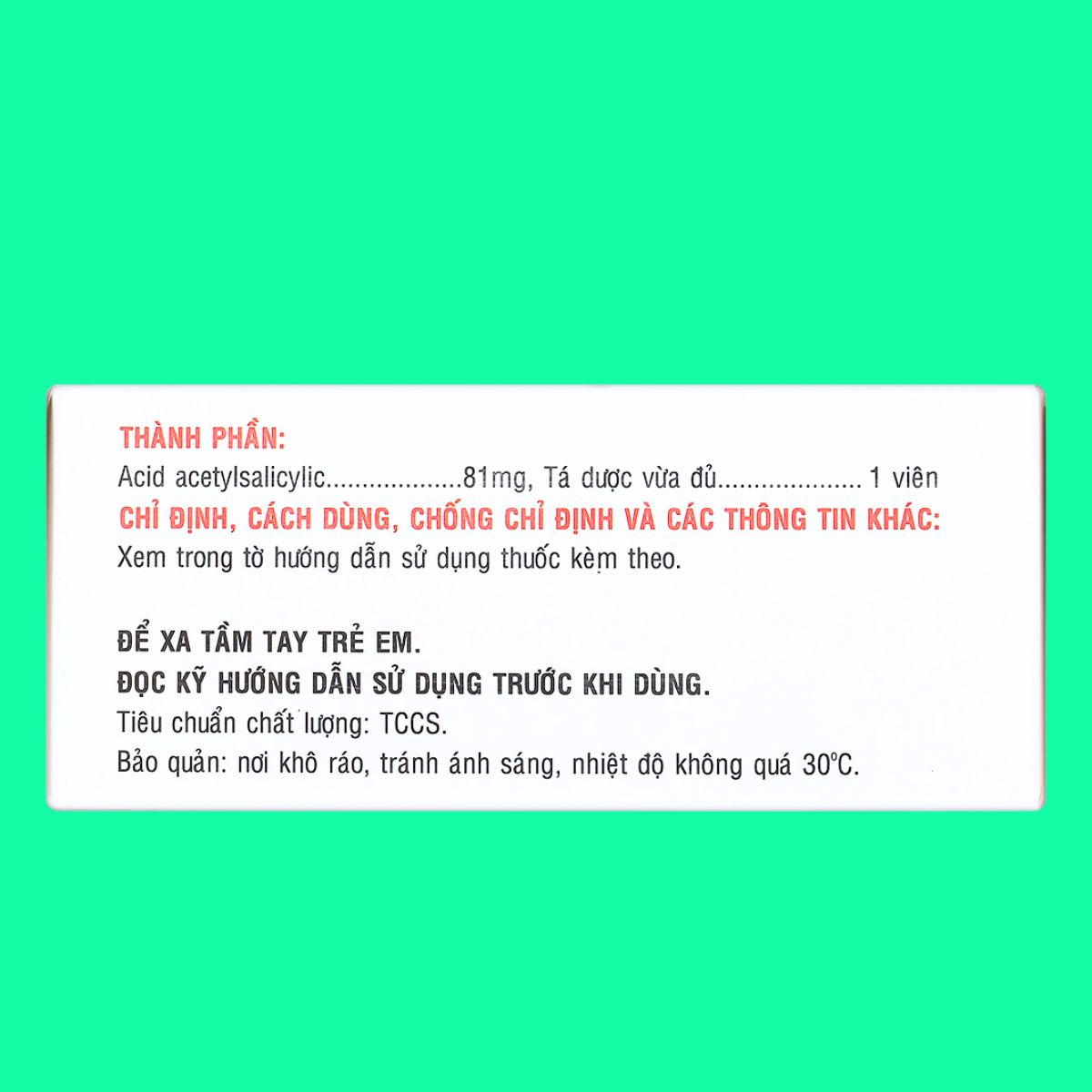 - Hoạt chất: Acid acetylsalicylic ……… 81 mg