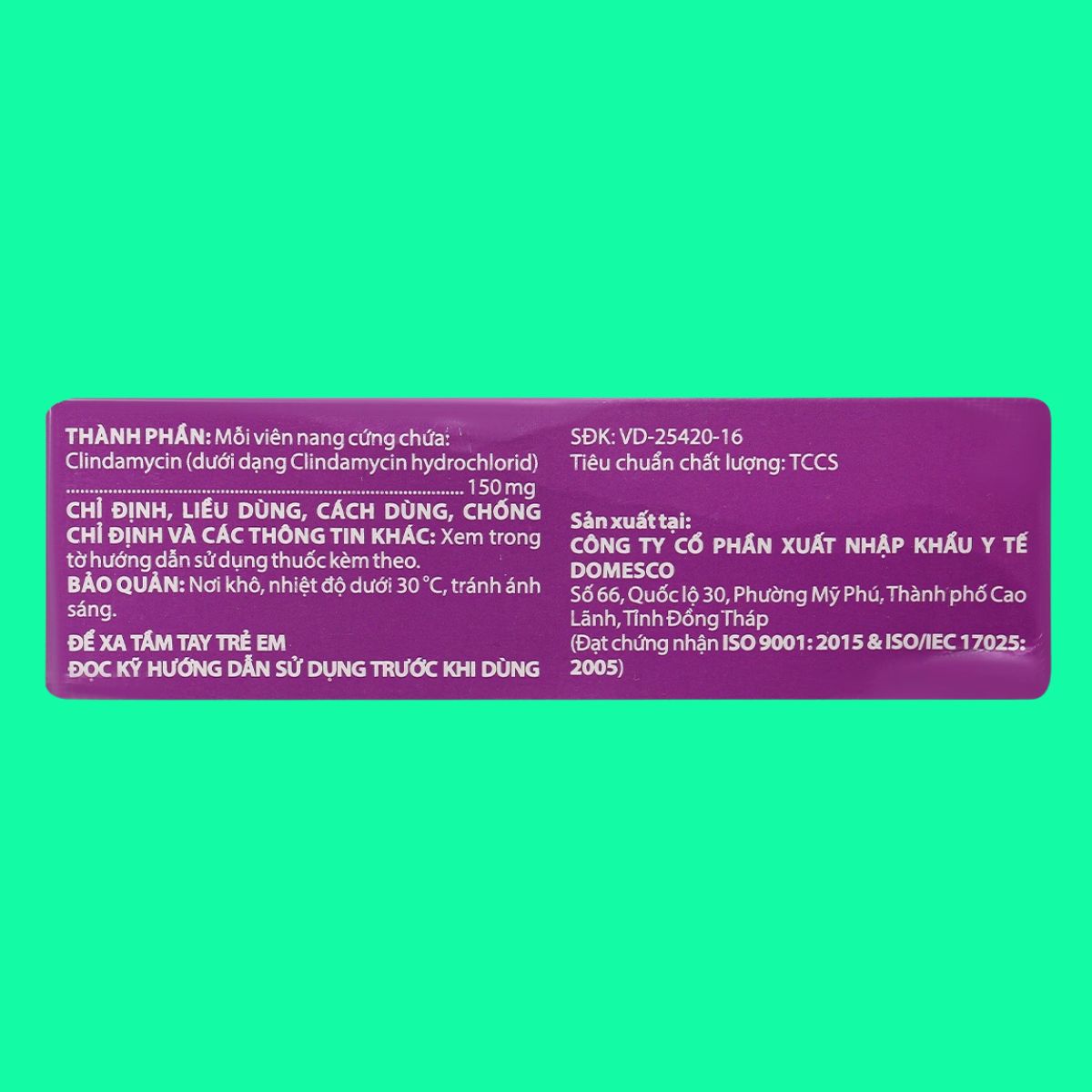 Trong bài viết này, dược sĩ Lưu Văn Hoàng giới thiệu đến các bạn sản phẩm thuốc Clindamycin 150mg Domesco được sản xuất bởi Công ty Cổ phần Xuất nhập khẩu Y tế Domesco, có số đăng ký lưu hành tại Việt Nam là 893110316223 (SĐK cũ: VD-25420-16).