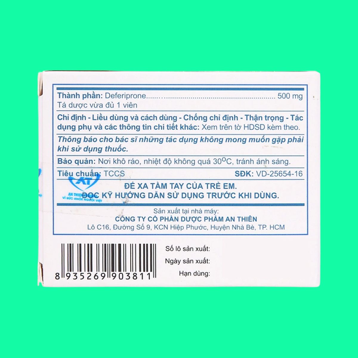 Thuốc Deferiprone A.T 500mg dùng cho bệnh nhân mắc bệnh Thalassemia bị quá tải sắt nhưng không đáp ứng điều trị hoặc chống chỉ định dùng Deferoxamine.
