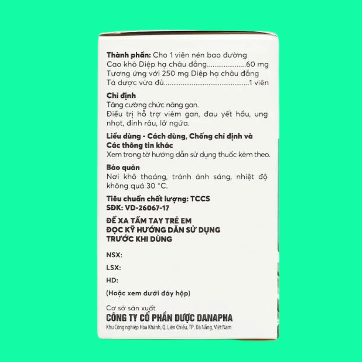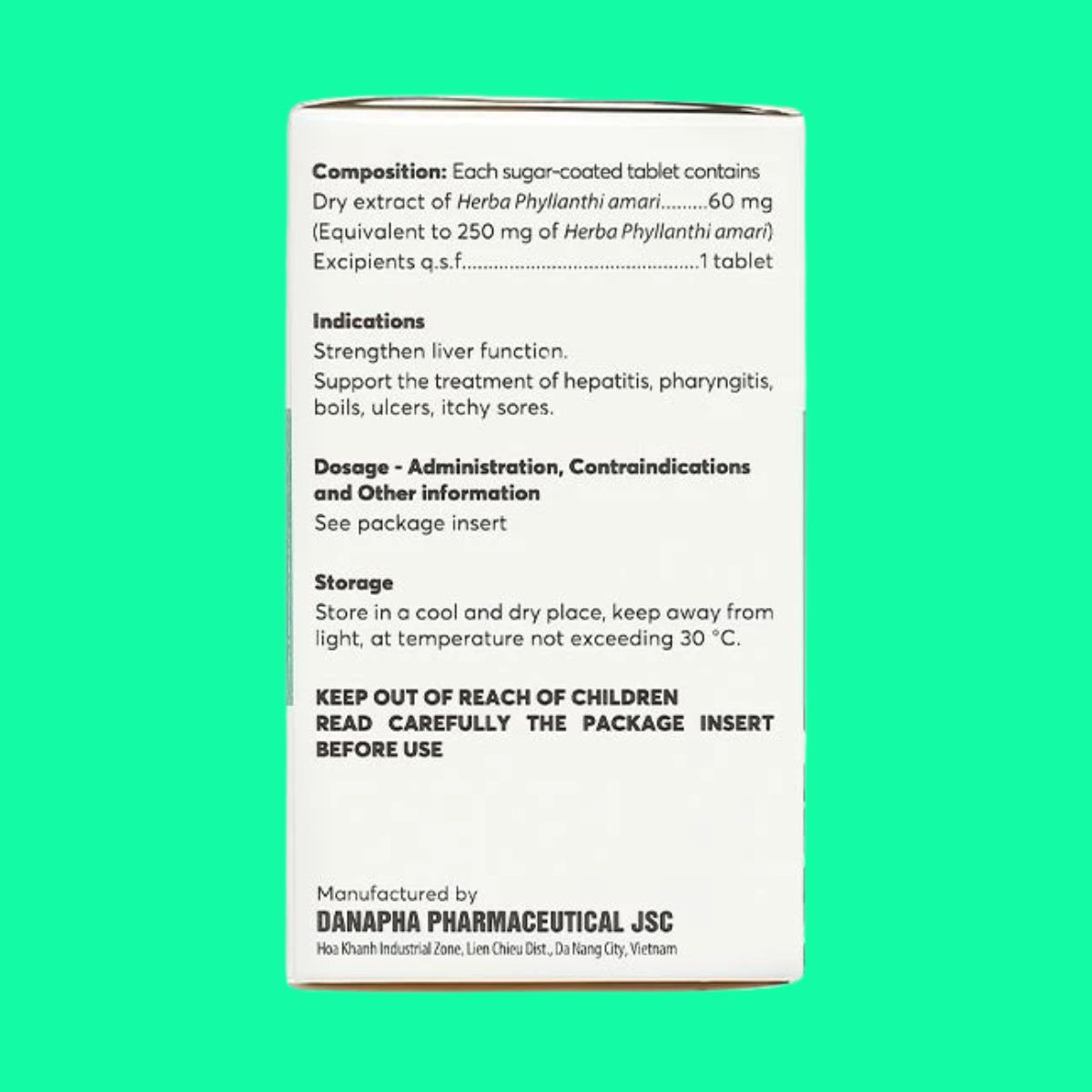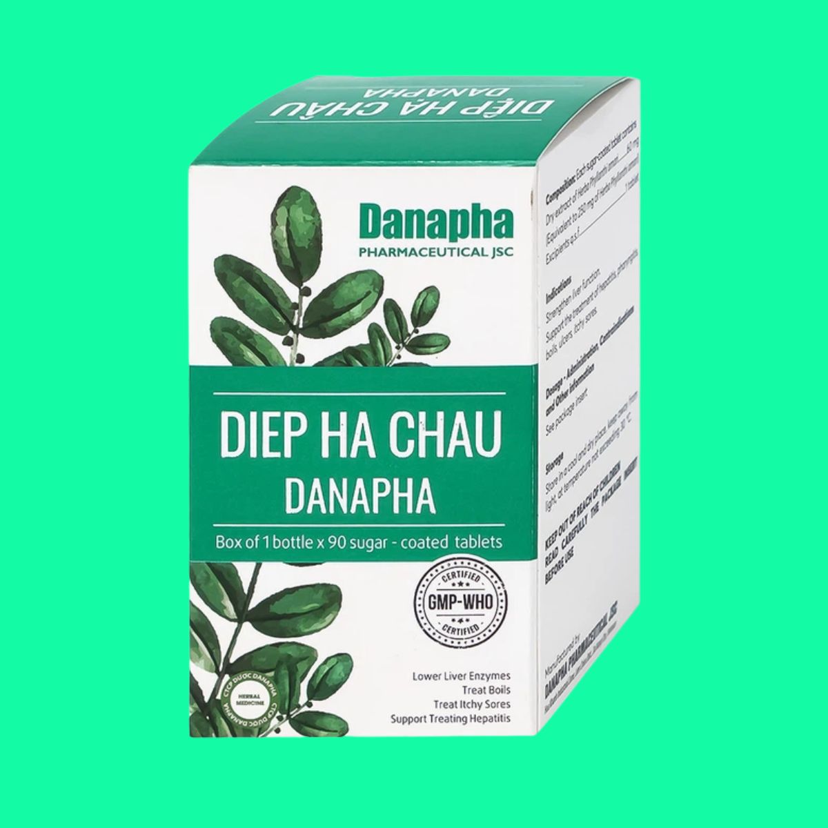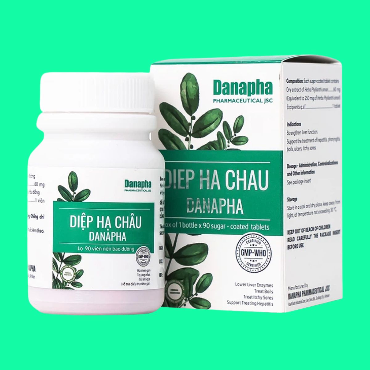 Thuốc Diệp Hạ Châu Danapha có chứa thành phần: Cao khô Diệp hạ châu đắng (Extractum Phyllanthi amari siccus) 60mg, tương ứng với 250mg Diệp hạ châu đắng (Herba Phyllanthi amari)