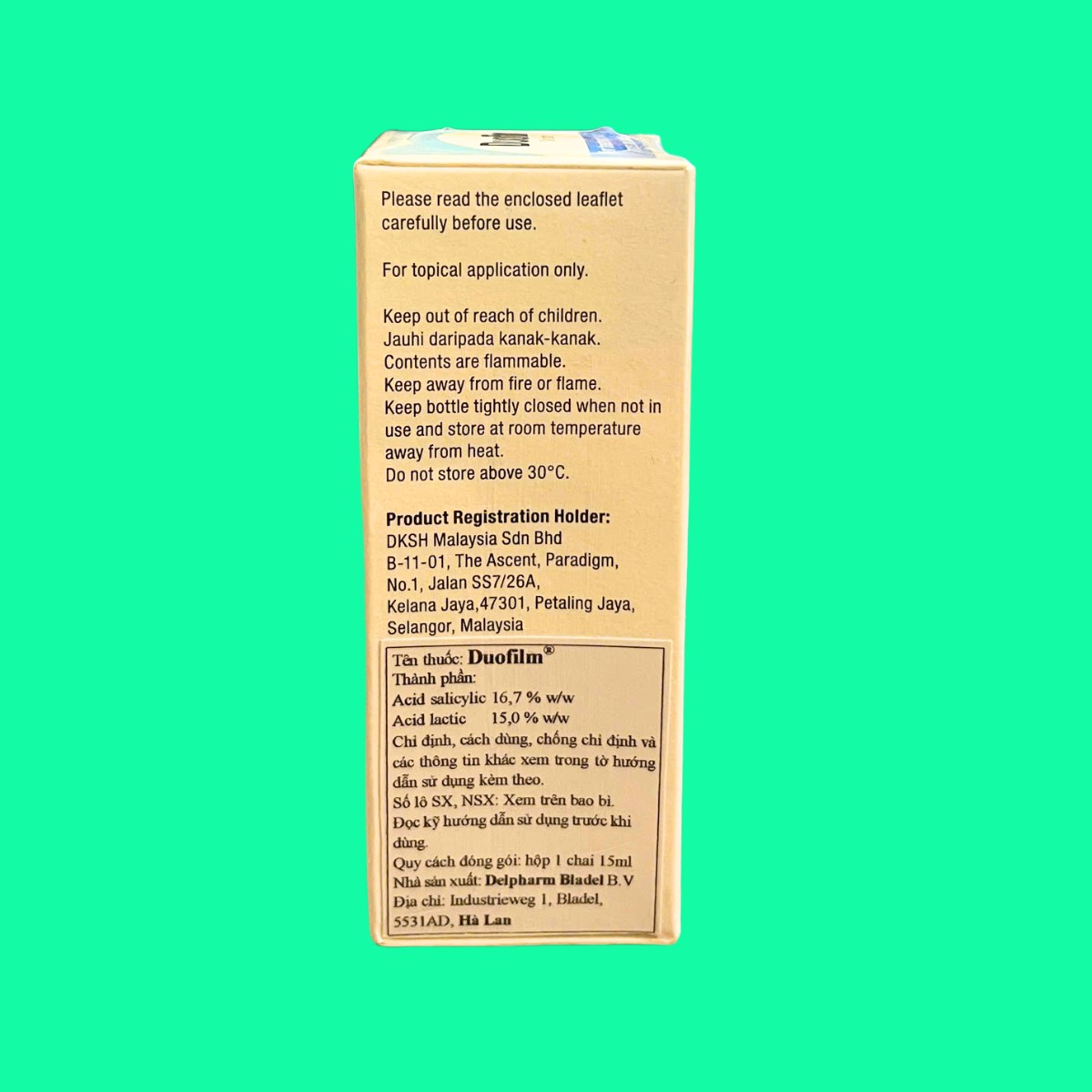 Thuốc Duofilm là thuốc điều trị mụn cóc, mụn sinh dục sùi mào gà có thành phần chính bao gồm Acid salicylic 16,7%, Acid lactic 16,7% Và các tá dược khác vừa đủ 15ml một chai.