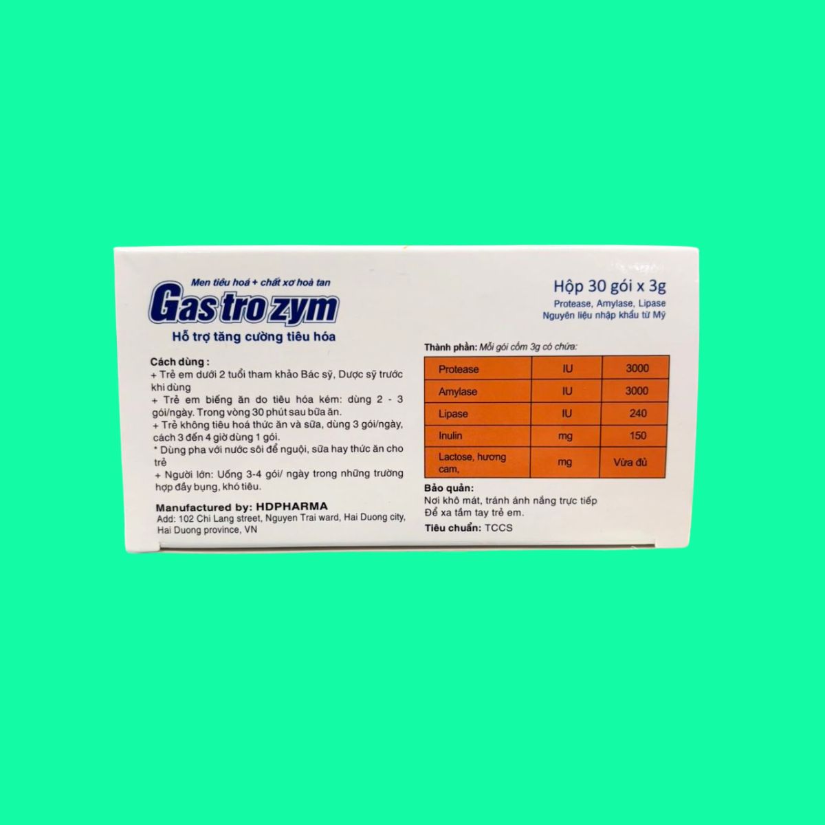 Mỗi hộp Gastrozym có 20 gói, mỗi gói nặng 3g được sản xuất theo tiêu chuẩn của nhà sản xuất.