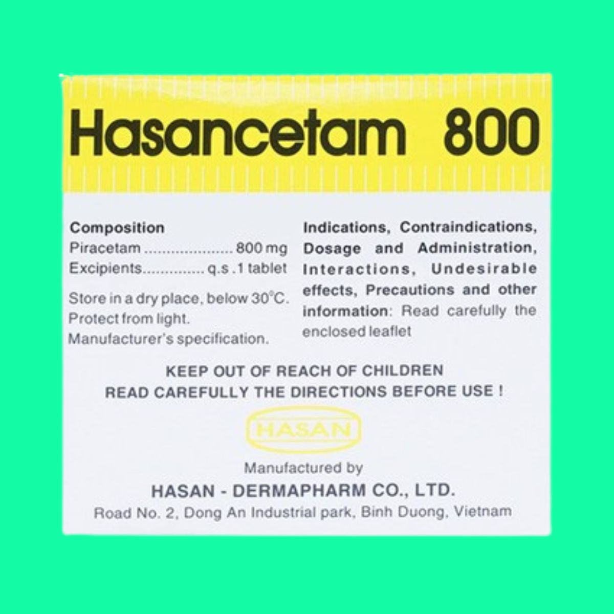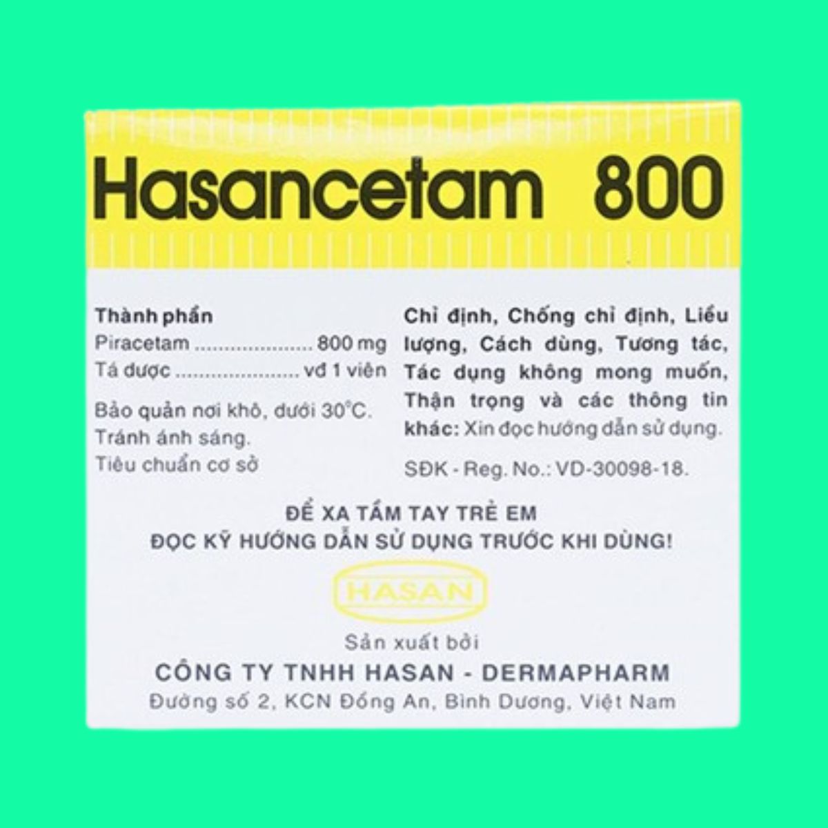 Trong bài viết này, dược sĩ Lưu Văn Hoàng giới thiệu đến các bạn sản phẩm thuốc Hasancetam 800 được sản xuất bởi Công ty TNHH Hasan – Dermapharm, có số đăng ký lưu hành tại Việt Nam là 893110332823 (SĐK cũ: VD-30098-18).