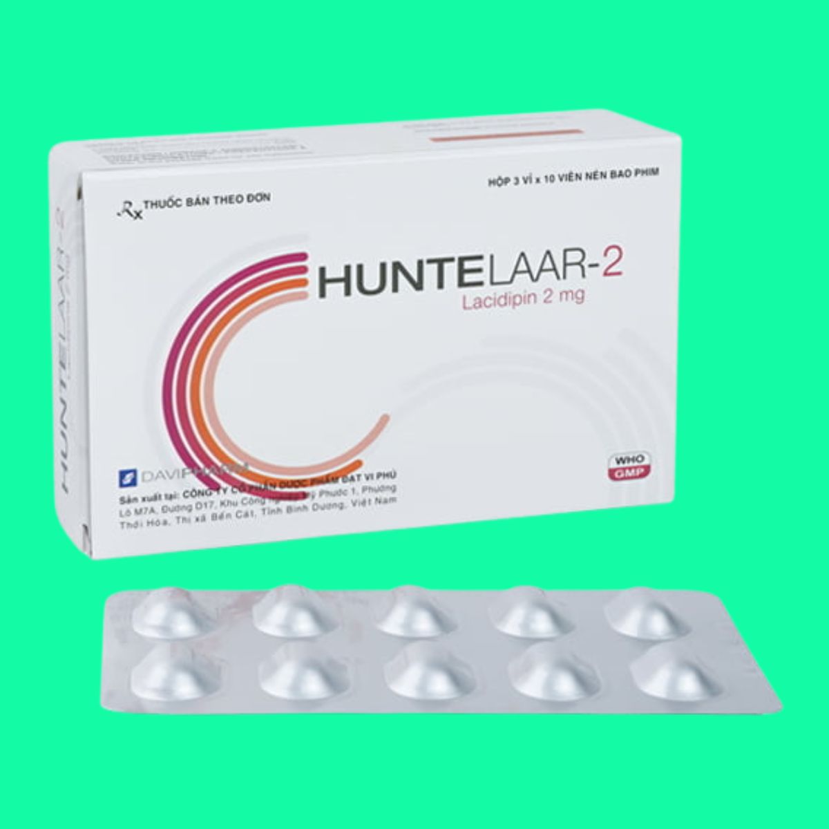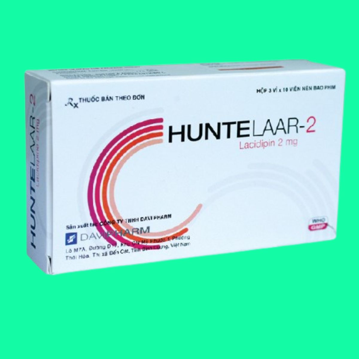 Huntelaar 4mg có thành phần chính là Lacidipin 4mg, được sản xuất bởi Công ty cổ phần dược phẩm Đạt Vi Phú (Davipharm), điều tị tăng huyết áp