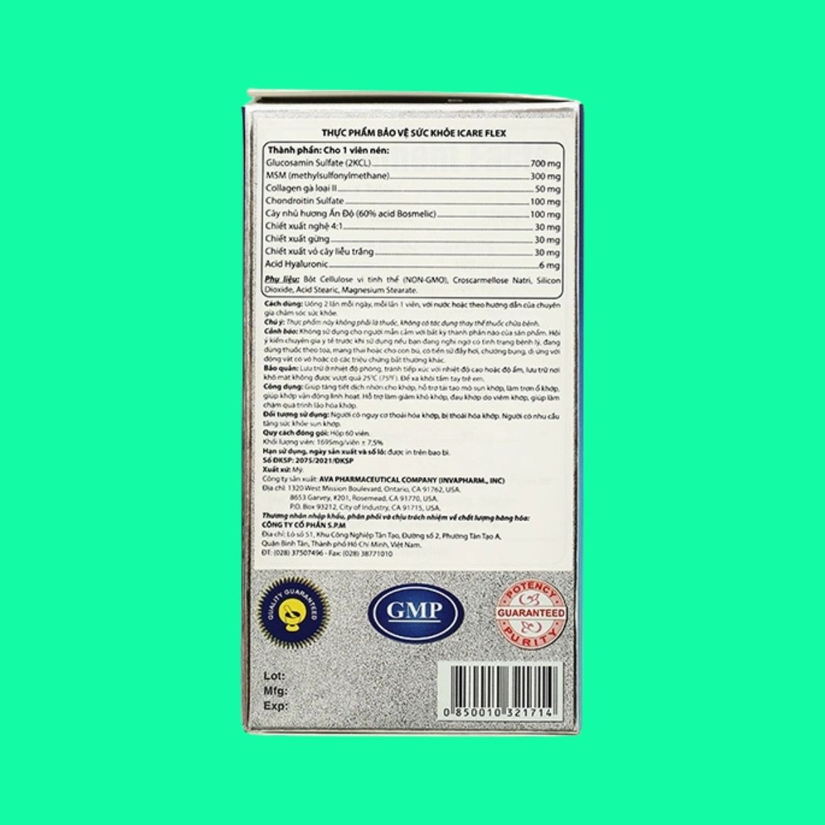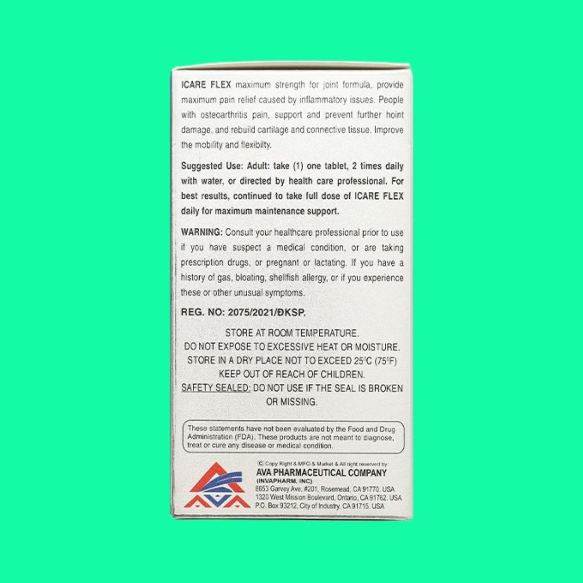 Icare Flex 60 viên kích thích tăng tiết dịch khớp, làm trơn ổ khớp, cải thiện tính linh hoạt trong vận động và di chuyển, được sản xuất bởi AVA PHARMACEUTICAL COMPANY (INVAPHARM., INC)