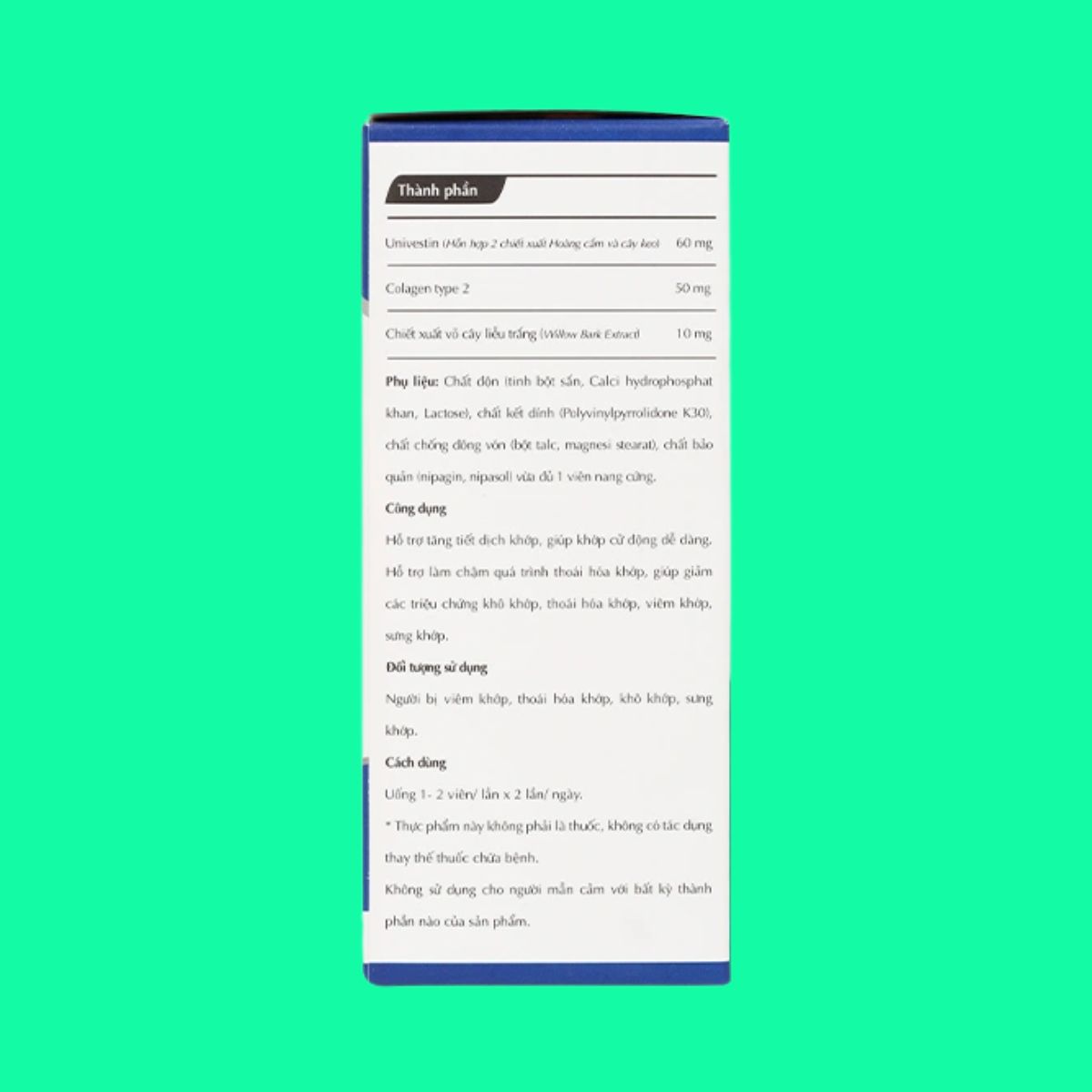 - Univestin (hỗn hợp 2 chiết xuất hoàng cầm và cây keo) cung cấp các thành phần có đặc tính ức chế đồng thời COX-1 và COX-2 (enzyme gây phản ứng viêm trong cơ), từ đó hạn chế các tác nhận gây viêm, gây triệu chứng sưng đau khớp, đồng thời giúp giảm đau nhanh chóng. Trong thành phần còn chứa các hợp chất chống oxy hóa, hạn chế sự tác động của gốc tự do, tăng cường bảo vệ tế bào sụn khớp, hạn chế quá trình thoái hóa khớp. Hỗn hợp chiết xuất từ tự nhiên an toàn và lành tính đối với người sử dụng, hạn chế tác dụng phụ trên dạ dày.