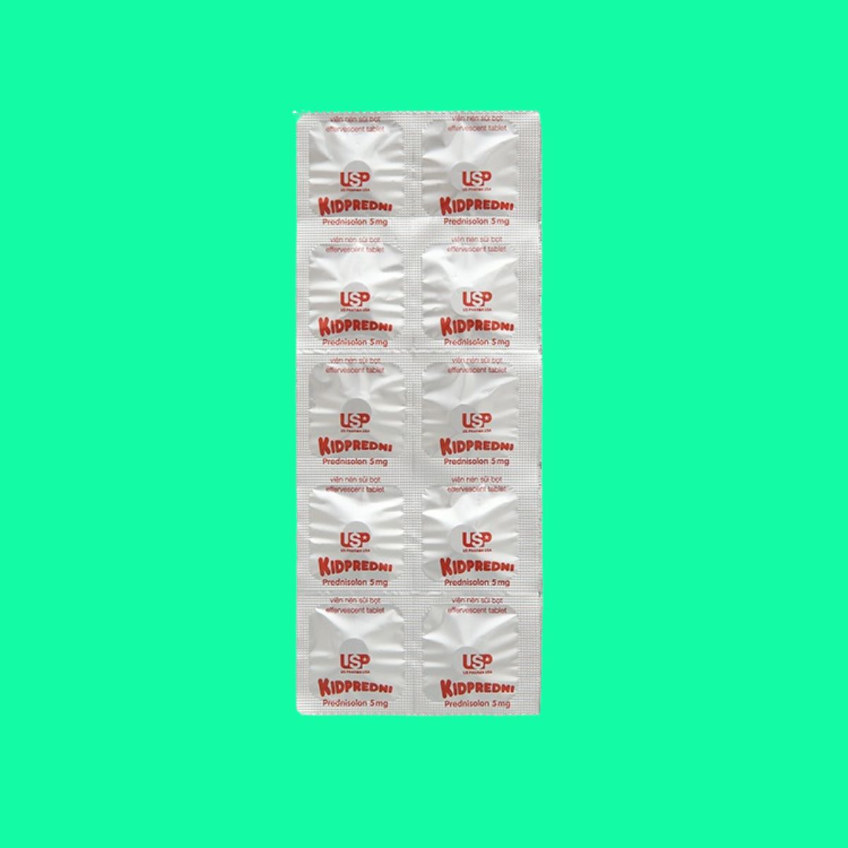 Thuốc Kidpredni 5mg dạng viên nén sủi, hòa cùng một lượng nước uống vừa đủ, sử dụng trực tiếp. Không dùng thuốc cùng sữa, cà phê, đồ uống có gas, đồ uống chứa cồn, calci.