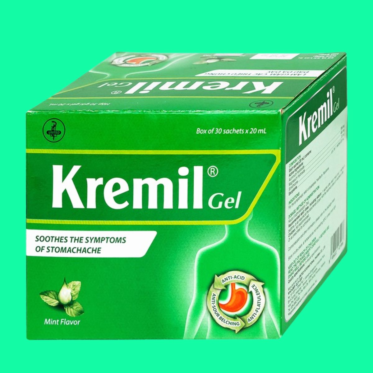 Kremil-S United có thành phần chính là Aluminum Hydroxide 178mg; Magnesium Hydroxide 233mg; Simethicone 30mg, được sản xuất bởi Công ty TNHH United International Pharma, chỉ định trong điều trị đau dạ dày, giảm nóng rát dạ dày, ợ nóng, ợ chua.