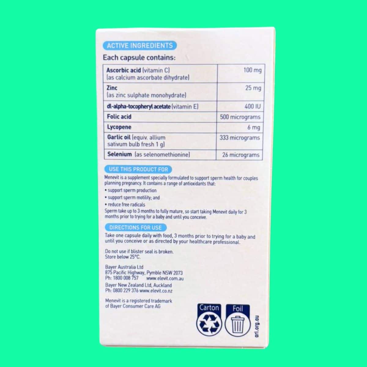 Trong bài viết này, nhà thuốc Lưu Văn Hoàng giới thiệu đến các bạn sản phẩm Menevit được sản xuất bởi thương hiệu nổi tiếng Bayer – Úc. Sản phẩm được nhập khẩu chính hãng về việt nam từ nhà phân phối ChemistWarehouse – Úc.