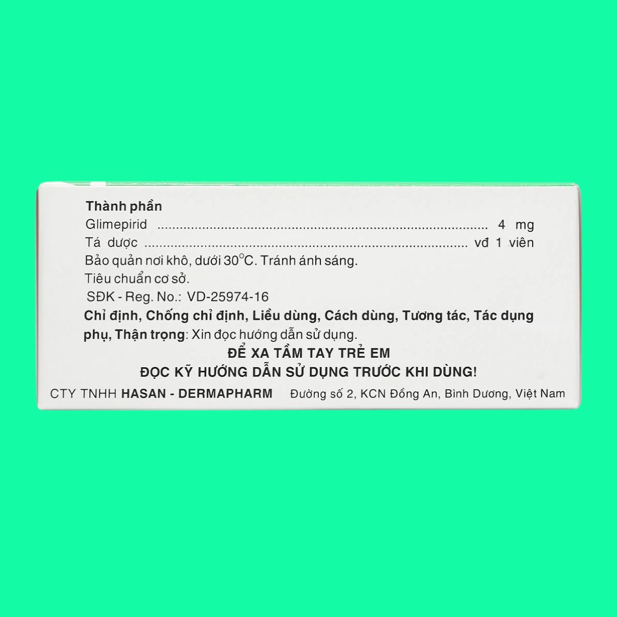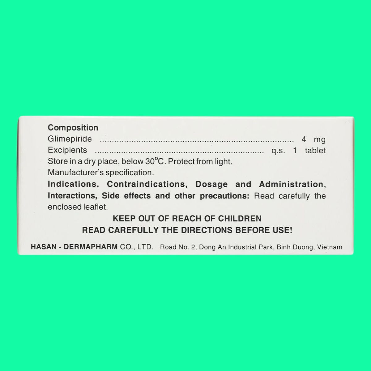 Glumerif 4 có thành phần Glimepirid 4mg, sản xuất bởi Công ty Cổ Phần Dược Hậu Giang – Chi nhánh nhà máy dược phẩm DHG tại Hậu Giang, điều trị bệnh đái tháo đường tuyp 2 không phụ thuộc insulin
