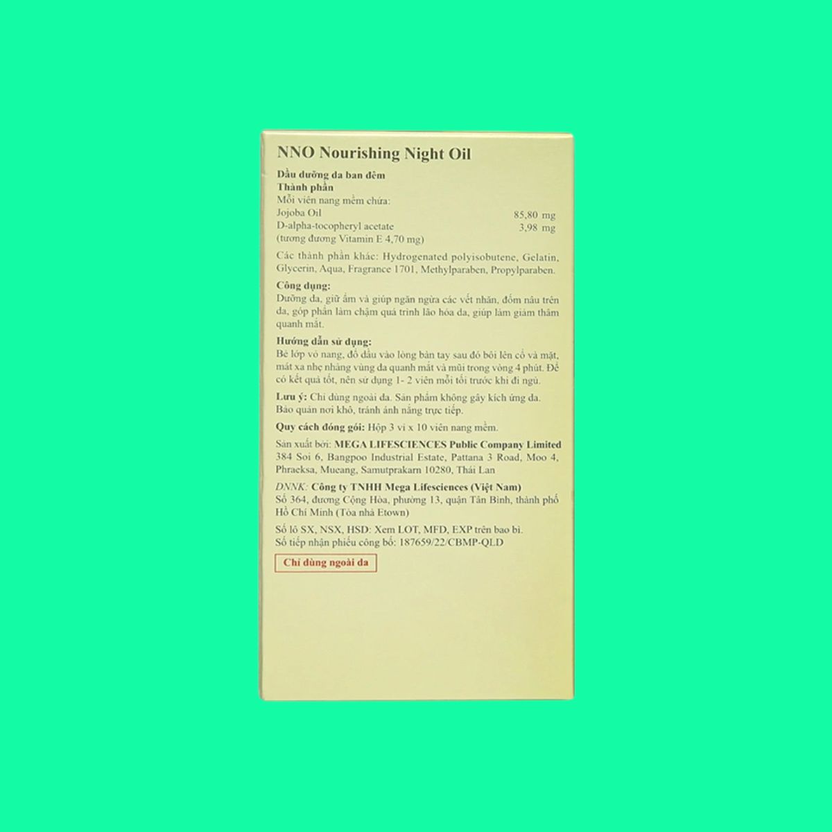 Trong bài viết này, dược sĩ Lưu Văn Hoàng giới thiệu đến các bạn sản phẩm NNO Nourishing Night Oil được sản xuất bởi Mega Lifesciences Public Company Limited, có số đăng ký lưu hành tại Việt Nam là 187659/22/CBMP-QLD.