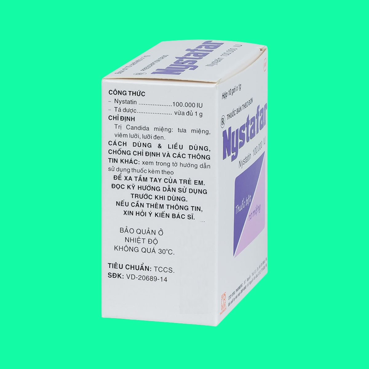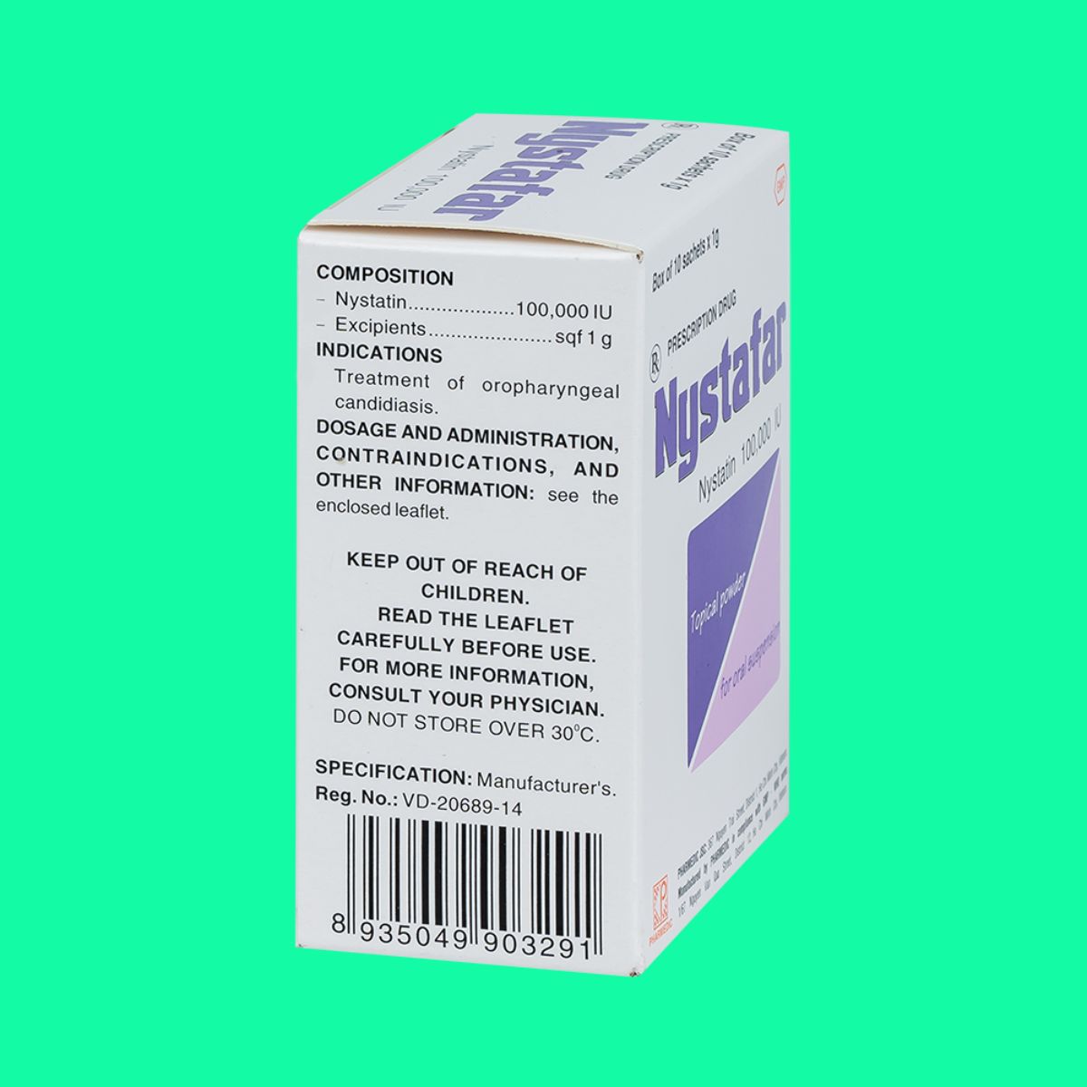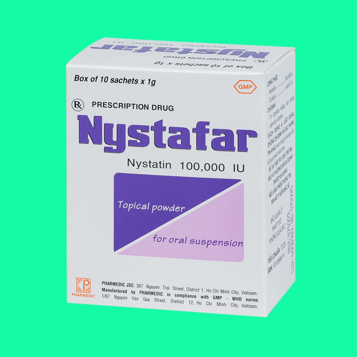 Thuốc Nystafar 100.000IU điều trị tình trạng viêm lưỡi, tưa miệng, lưỡi đen do nhiễm nấm candida, được sản xuất bởi Công ty cổ phần Dược phẩm Dược Liệu Pharmedic