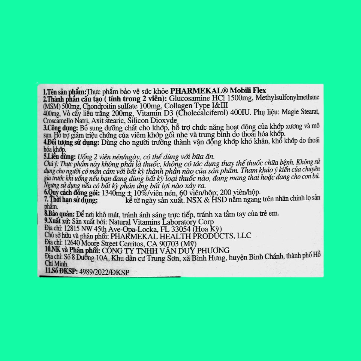 Viên uống Pharmekal Mobili Flex hỗ trợ bổ sung các chất dinh dưỡng cần thiết cho khớp, cải thiện khả năng hoạt động của xương khớp và sụn; sản xuất bởi Natural Vitamins Laboratory Corp