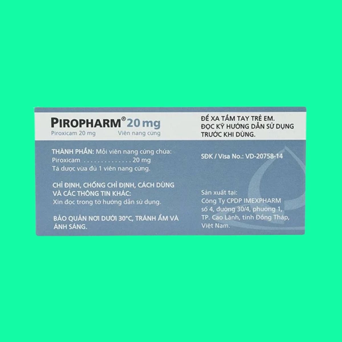 Trong bài viết này, dược sĩ Lưu Văn Hoàng giới thiệu đến các bạn sản phẩm thuốc Piropharm 20mg được sản xuất bởi Công ty Cổ phần Dược Phẩm Imexpharm, có số đăng ký lưu hành tại Việt Nam là 893110254523 (SĐK cũ: VD-20758-14).
