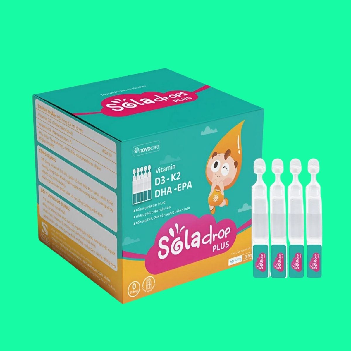 Sản phẩm Sola Drops Plus là thực phẩm bổ sung vitamin D3, K2, DHA, EPA, hỗ trợ hấp thu canxi, giúp xương răng chắc khỏe, tăng cường trí não, thị giác và miễn dịch.