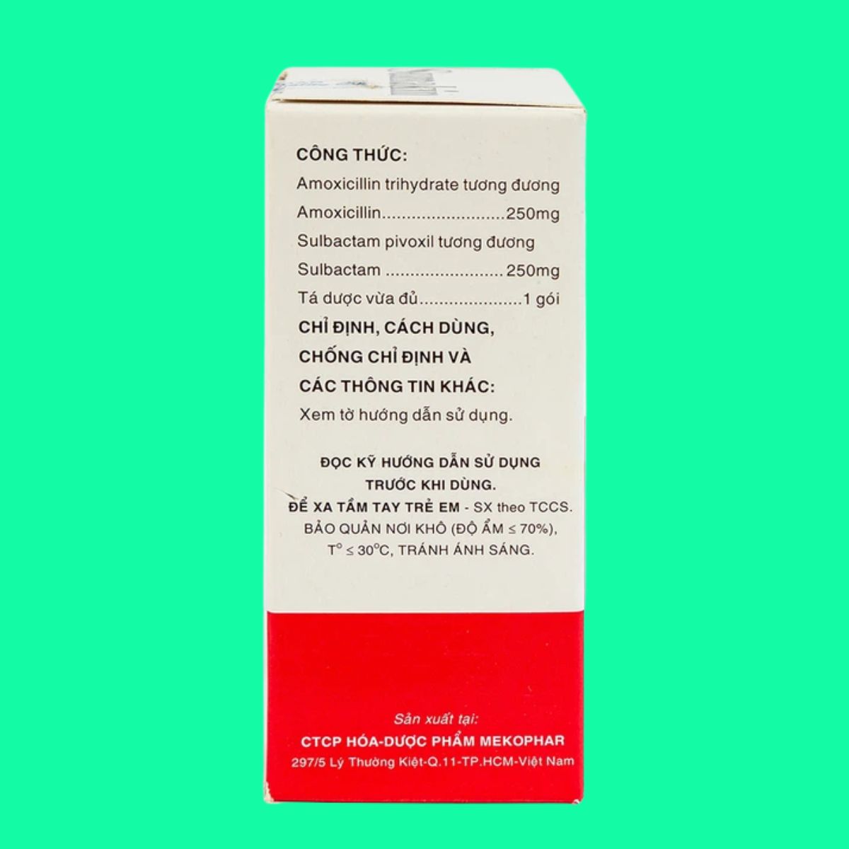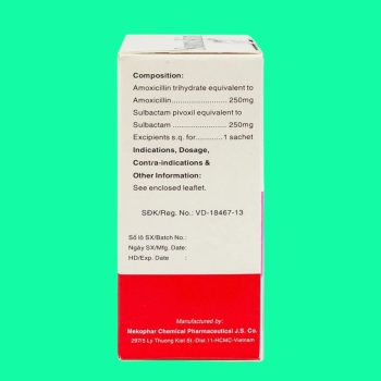 Trimoxtal 250/250 (cốm) có thành phần chính là Amoxicillin 250mg và Sulbactam 250mg, được sản xuất bởi Công ty cổ phần dược Minh Hải, điều trị nhiễm khuẩn