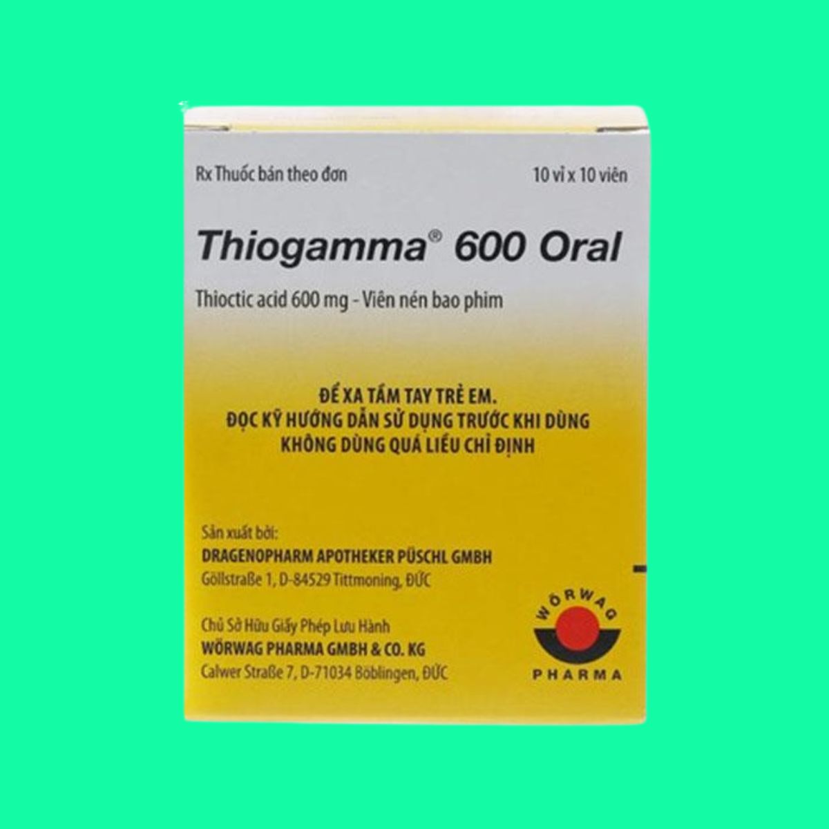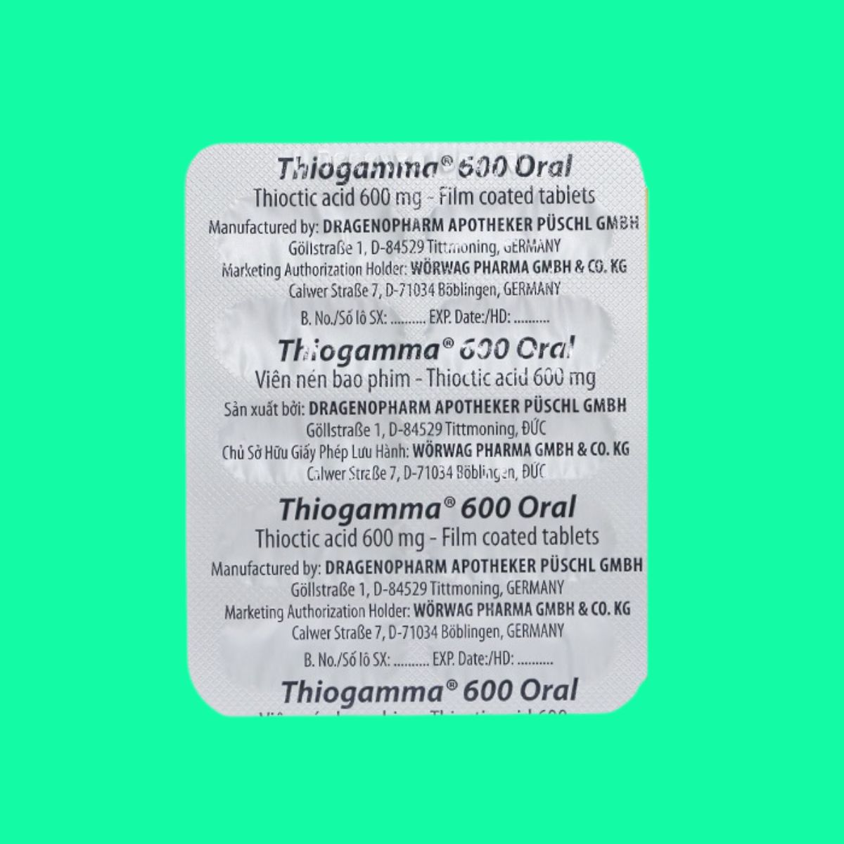 Thuốc Thiogamma 600 Oral được chỉ định trong điều trị rối loạn cảm giác do viêm đa dây thần kinh đái tháo đường, sản xuất bởi Dragenopharm Apotheker Püschl GmbH, số đăng ký VN-12729-11