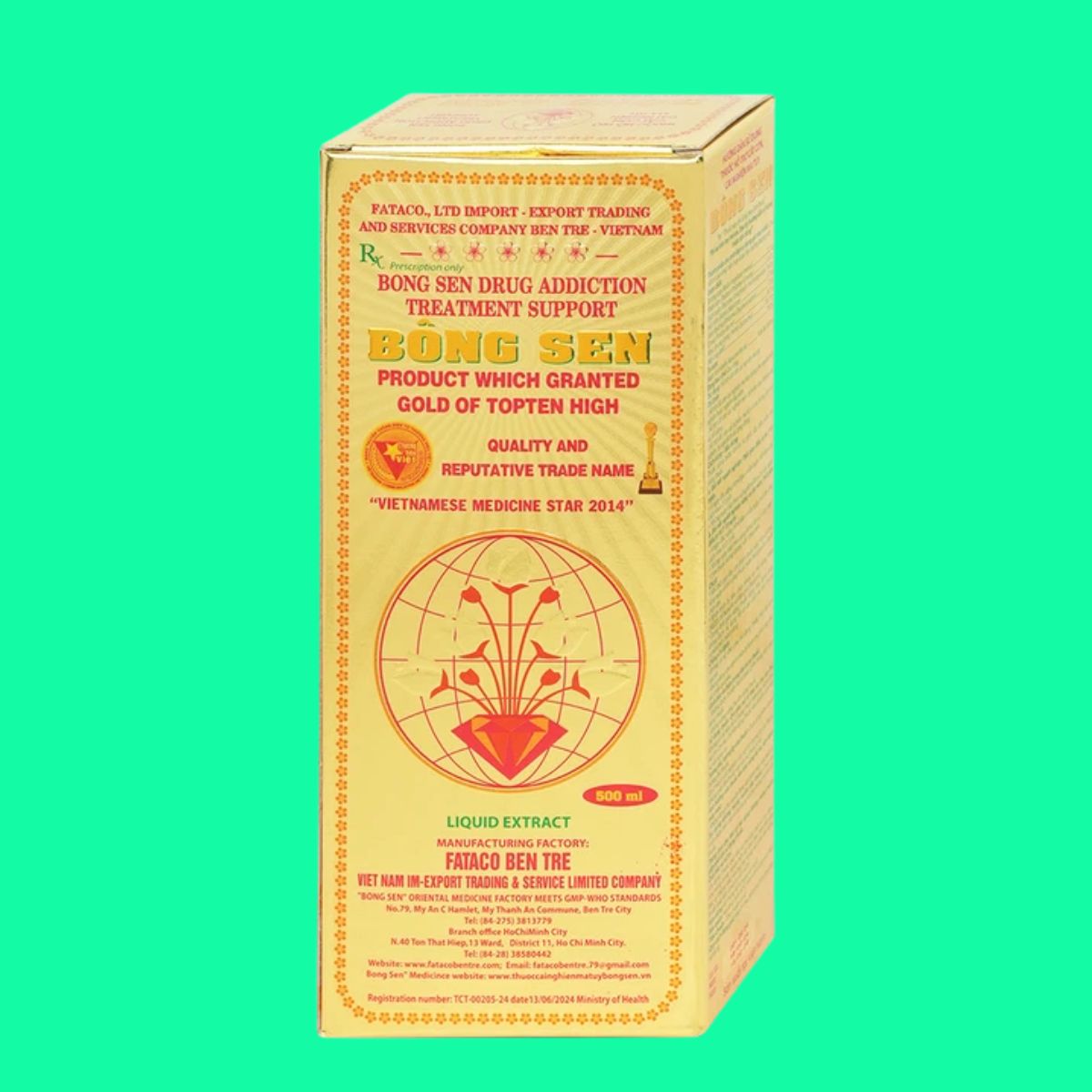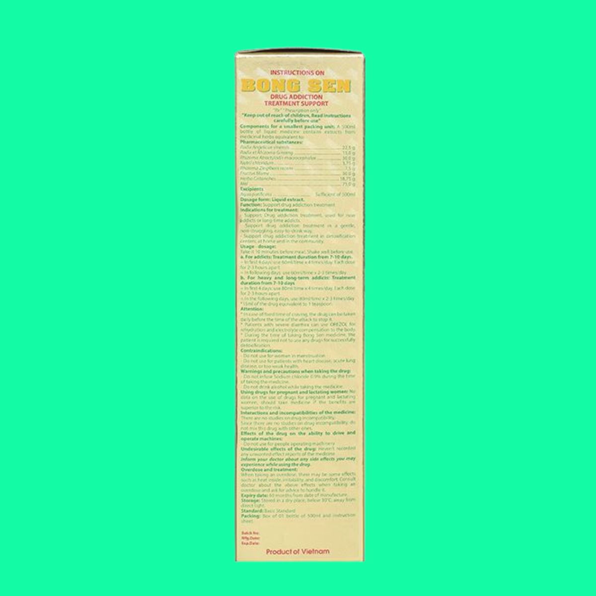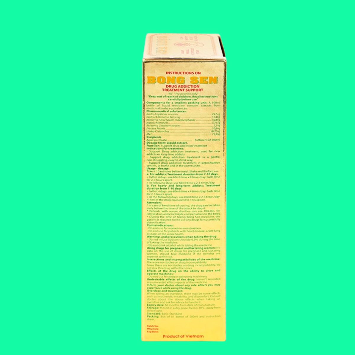 - Tá dược: Nước tinh khiết (Aqua purificata) vừa đủ 500 ml.