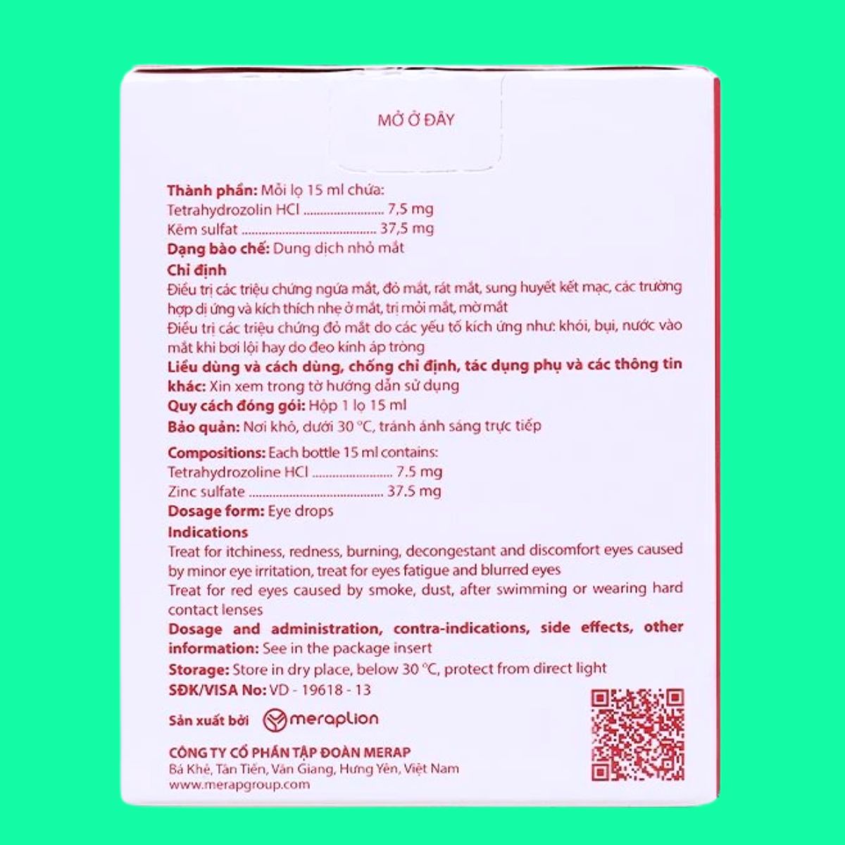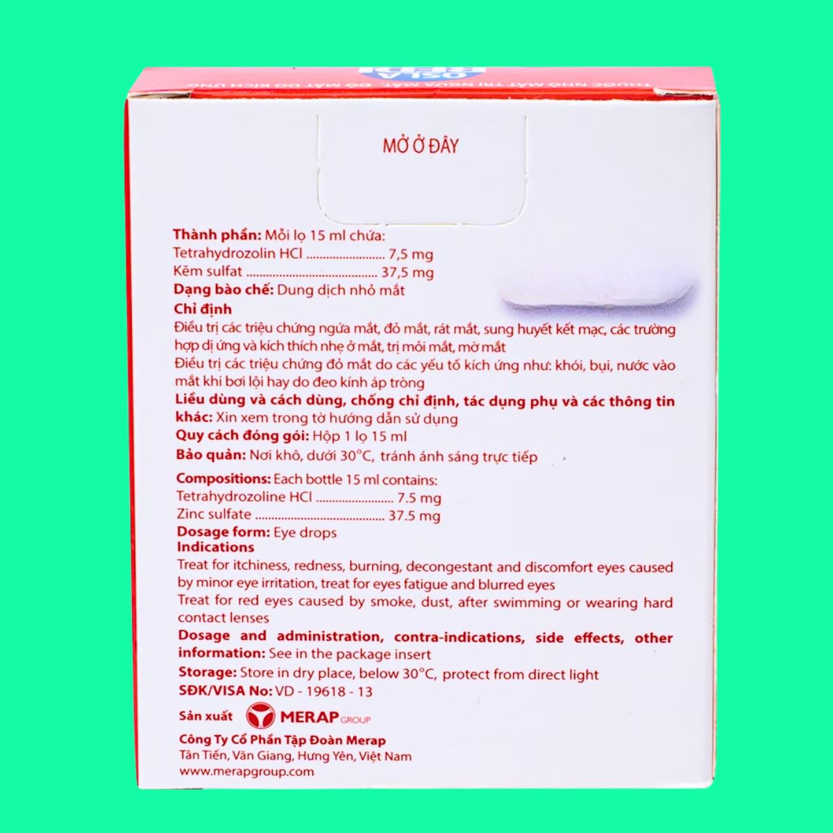 Kẽm sulfat: Có tác dụng kháng khuẩn nhẹ, giúp ngăn ngừa nhiễm khuẩn thứ phát ở mắt khi bị kích ứng hoặc viêm nhẹ.