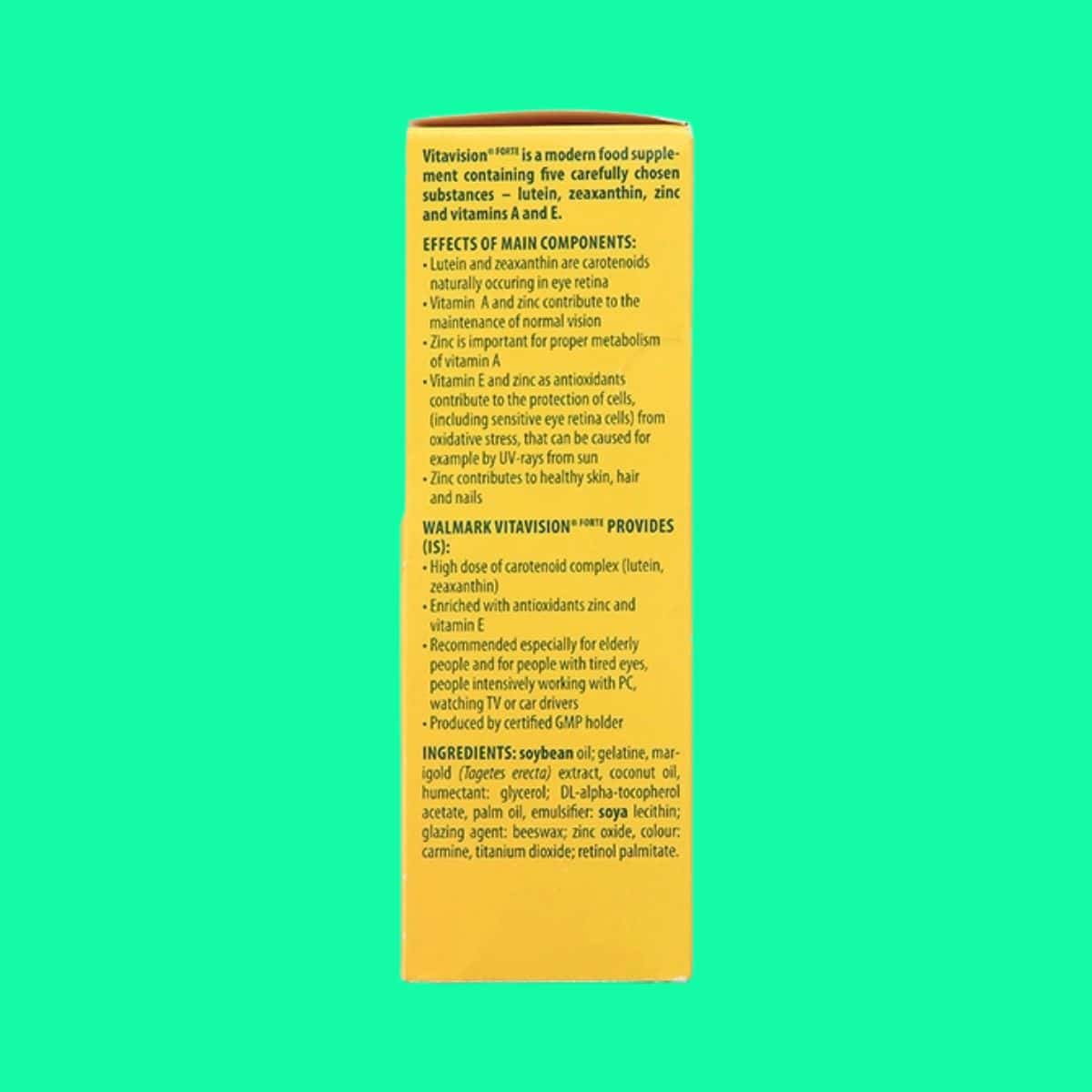 Vitavision Forte với sự kết hợp của nhiều thành phần dưỡng chất tốt cho mắt giúp cải thiện thị lực, phòng ngừa nguy cơ thoái hóa điểm vàng và đục thủy tinh thể.