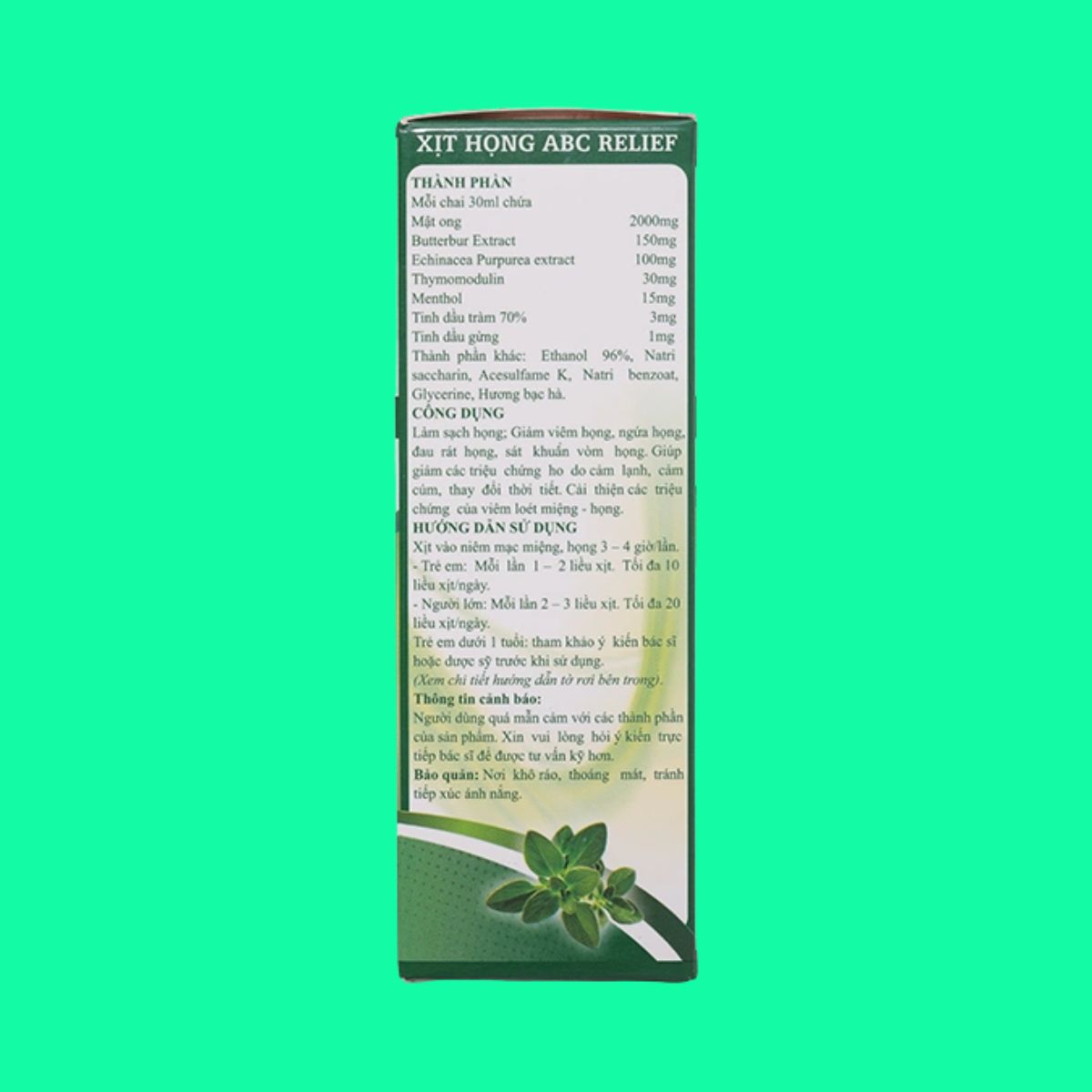 Xịt Họng Abc Relief hỗ trợ làm sạch họng, cải thiện triệu chứng viêm họng, đau rát họng, ngứa họng; giảm thiểu tình trạng ho do cảm lạnh và cảm cúm, ho do thay đổi thời tiết; hỗ trợ cải thiện tình trạng viêm loét vòm họng