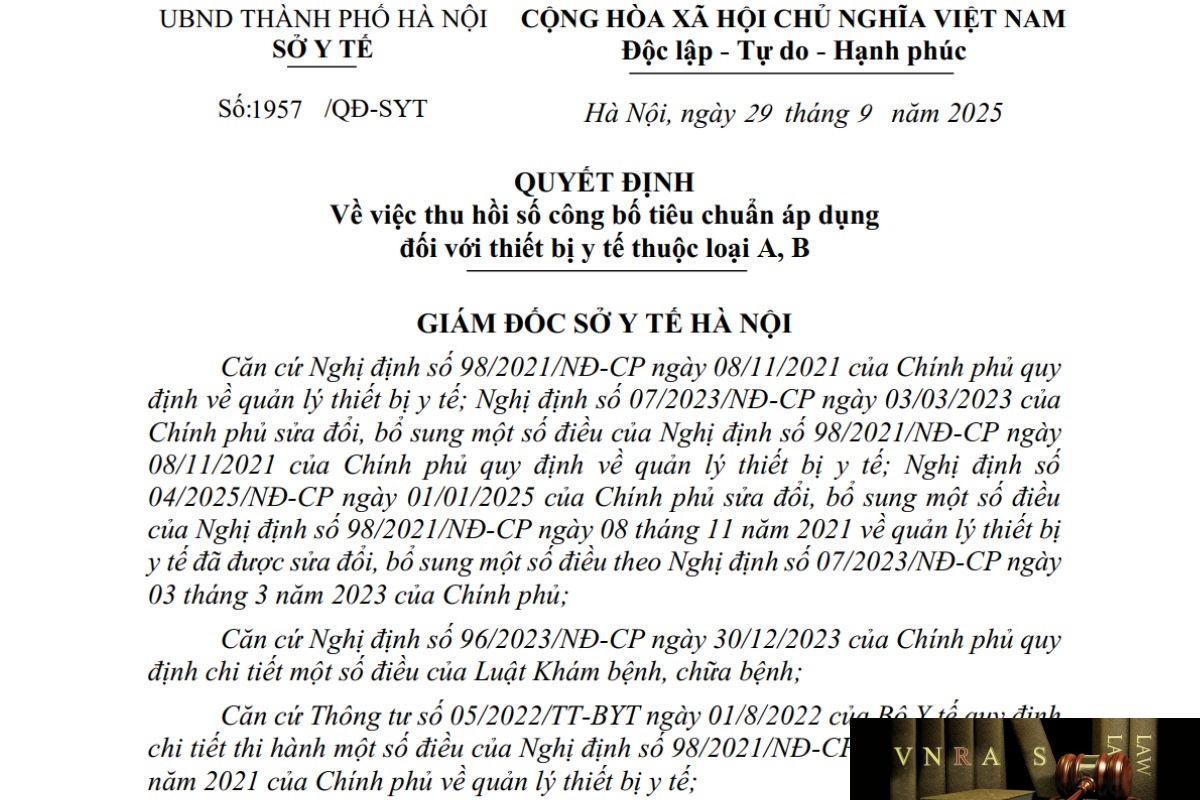 Căn cứ Nghị định số 98/2021/NĐ-CP ngày 08/11/2021 của Chính phủ quy định về quản lý thiết bị y tế; Nghị định số 07/2023/NĐ-CP ngày 03/03/2023 của Chính phủ sửa đổi, bổ sung một số điều của Nghị định số 98/2021/NĐ-CP ngày 08/11/2021 của Chính phủ quy định về quản lý thiết bị y tế; Nghị định số 04/2025/NĐ-CP ngày 01/01/2025 của Chính phủ sửa đổi, bổ sung một số điều của Nghị định số 98/2021/NĐ-CP ngày 08 tháng 11 năm 2021 về quản lý thiết bị y tế đã được sửa đổi, bổ sung một số điều theo Nghị định số 07/2023/NĐ-CP ngày 03 tháng 3 năm 2023 của Chính phủ;